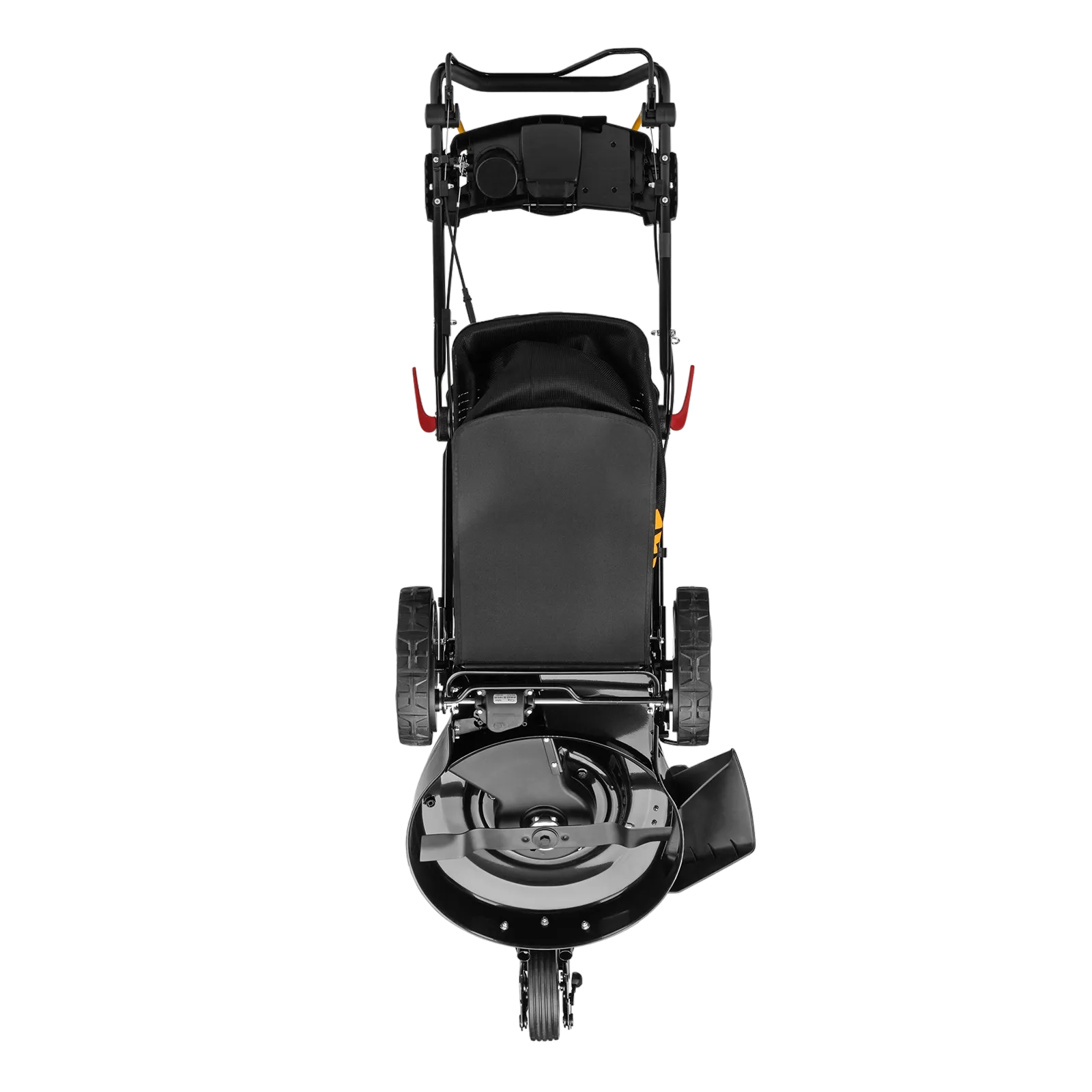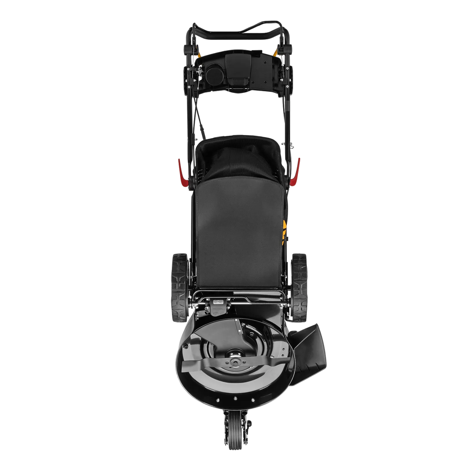 - Удобная система складывания — быстрозажимные эксцентриковые фиксаторы позволяют быстро собрать газонокосилку или подготовить ее к хранению.