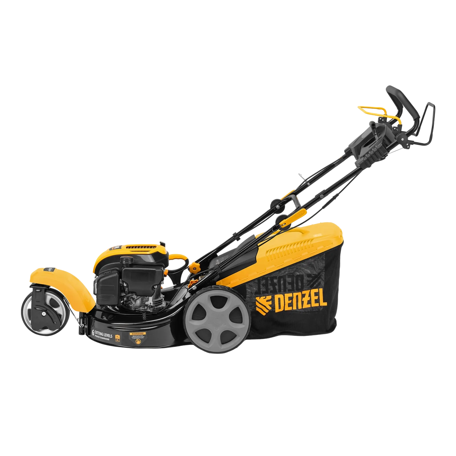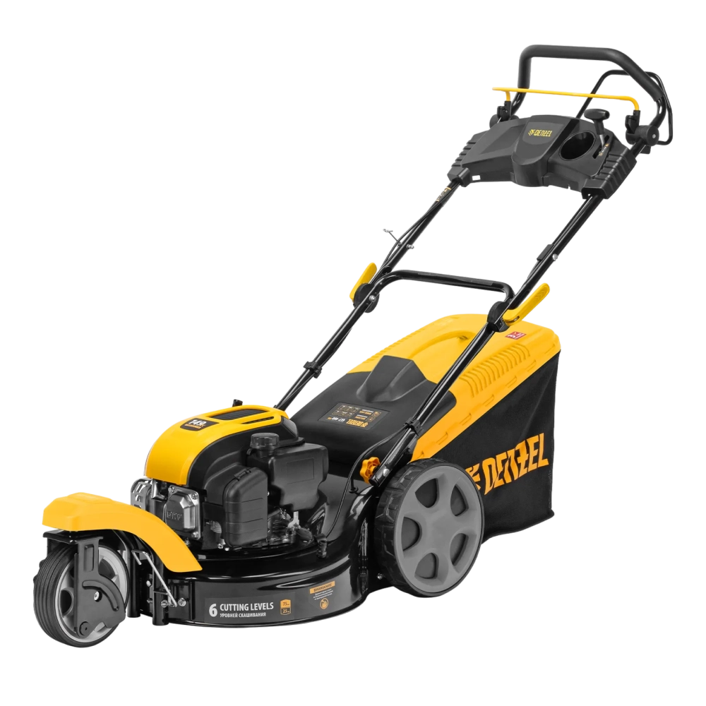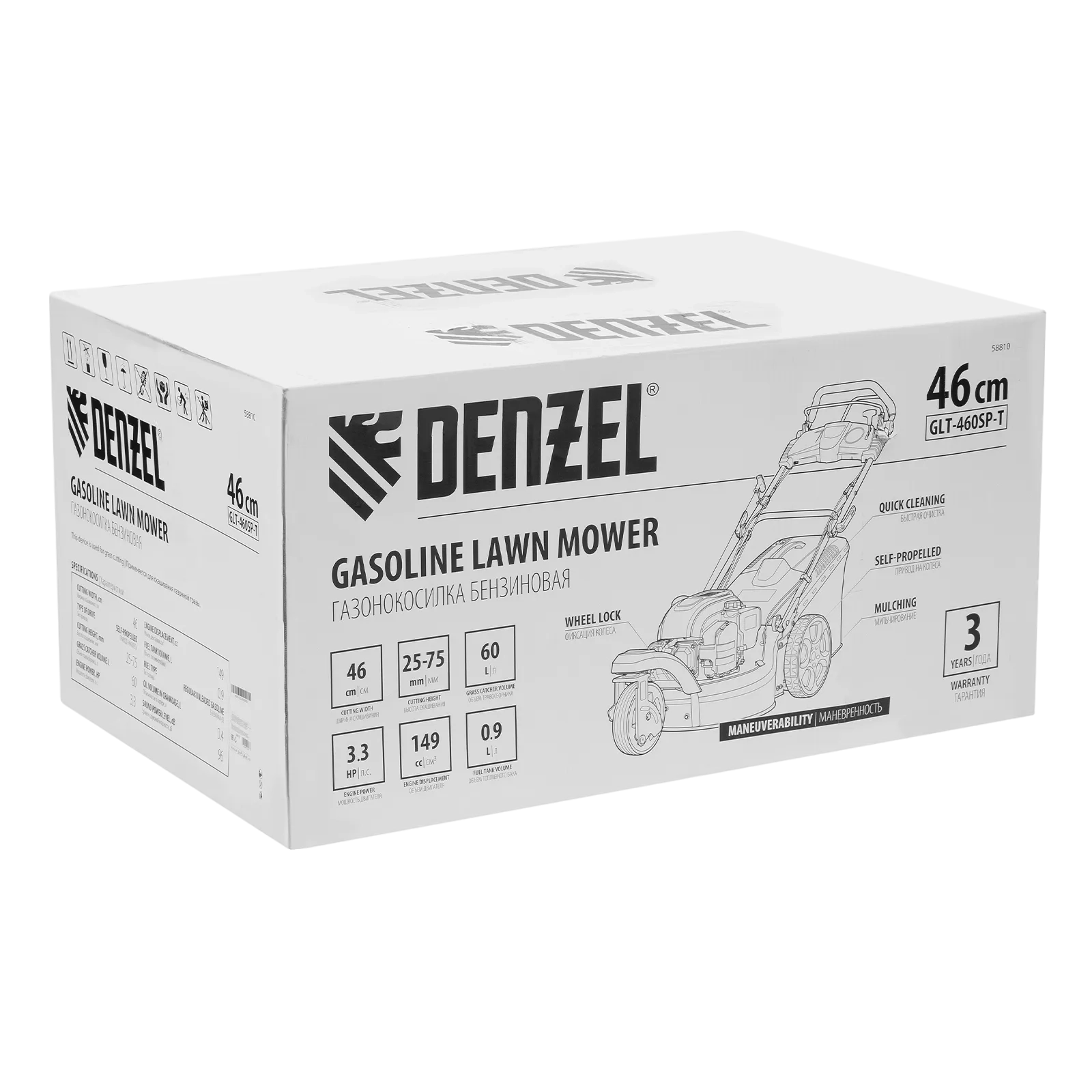 Трехколесная бензиновая газонокосилка Denzel GLT-460SP-T Trike 58810 с двигателем объемом 149 см3 и приводом на колеса, с травосборником на 60 л, обеспечивает ширину скашивания 46 см. Оптимальна для ухода за газоном на дачном участке. Позволяет установить необходимую высоту скашивания в соответствии с требованиями к травяному покрову, всего предусмотрено 6 уровней: от 25 до 75 мм. Благодаря поворотному переднему колесу модель GLT-460SP-T Trike отличается высокой маневренностью, что особенно удобно для скашивания травы между деревьями и кустами.
