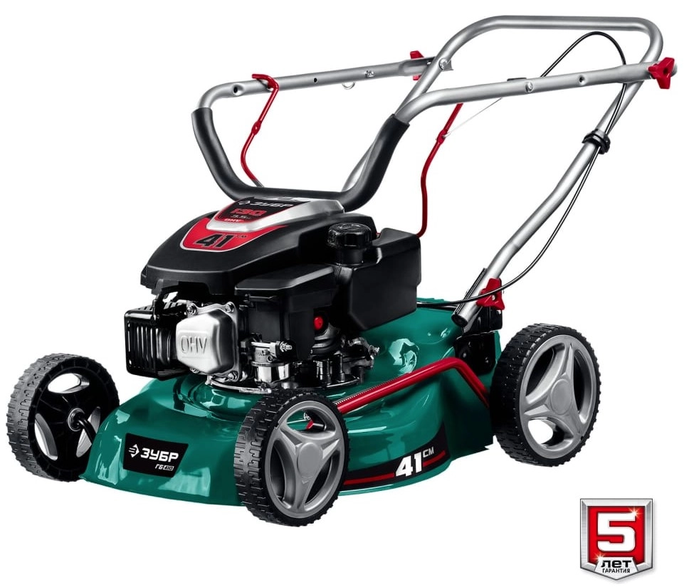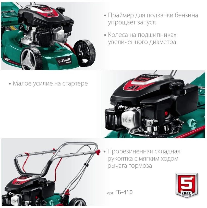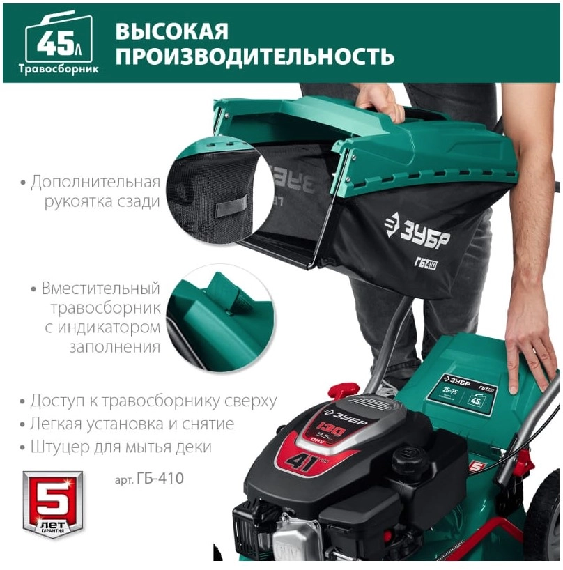 ХарактеристикиАртикул ГБ-410Бренды ЗубрСтрана производства КитайТип бензиноваяСамоходная нетМульчирование нетРасход топлива, л/час 0.9Объем топливного бака, л 1Мощность, л.с. 3,5Ширина скашивания 41Высота травы после стрижки, мм (мин-макс) 25-75Число оборотов холостого хода 3000Цвет зеленыйМатериал корпуса стальКоличество ступеней 7Объём двигателя 130Объем травосборника, л 45Тип ручки СкладнаяОбъем масляного бака, л 0.45Травосборник естьРегулировка высоты центральнаяРегулировка скорости нетВес 23Мощность двигателя 3.5Двигатель бензиновыйЕмкость топливного бака 1Объём травосборника 45Тип скашивания сбор в травосборникТравосборник комбинированныйДлина 74Количество колес 4Ширина 53Цикл двигателя 4-х тактныйВысота 41Рабочий объём двигателя 130Мин. Высота скашивания 25Регулировка высоты скашивания центральнаяМакс. Высота скашивания 75Складная ручка ДаСкорость вращения ножа 3000Объем масляного бака 0.45Количество уровней высоты обработки 7Описание товара обновлено 08.12.2025 14:46:09Легко подстрижет густую растительность на вашем газоне, а при систематичном использовании не даст сорнякам распространиться по участку. Она имеет более мощный (по сравнению с электрическими газонокосилками) двигатель, не боится влажной травы и может автономно работать в любой точке участка.
