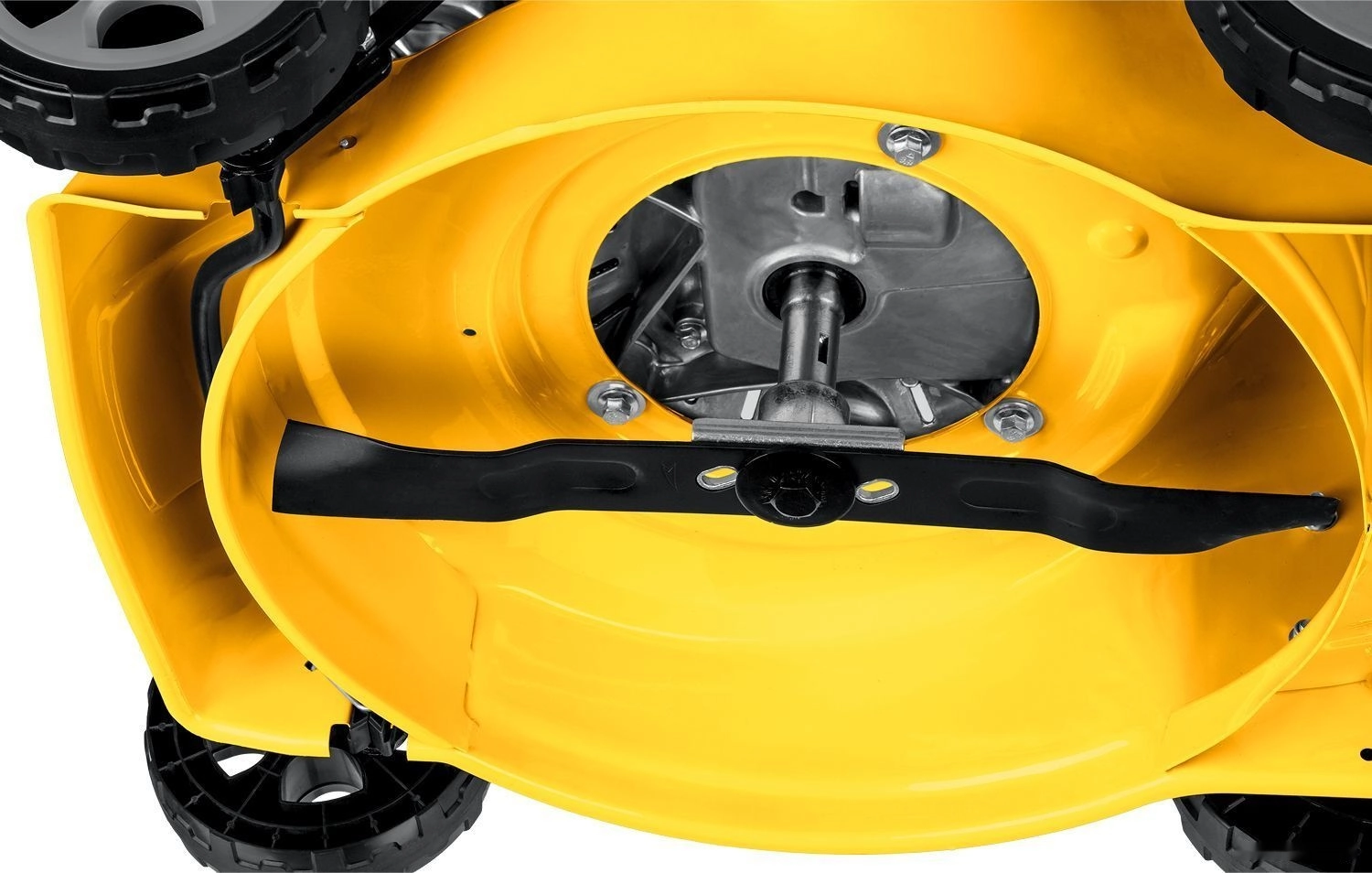 - Колеса увеличенного диаметра на подшипниках и эргономичная рукоятка облегчают перемещение косилки по газону