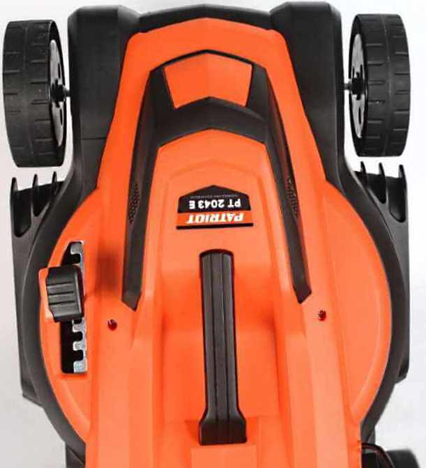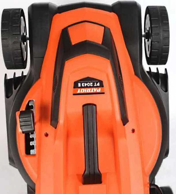 ПРОФИУровень качества. При классификации продуктов, имеющих схожее наименование, но обладающие различными потребительскими свойствами мы приняли следующий Вес факторов: 80% - подтвержденный ресурс, 15% - заявленная производительность/скорость, 5% - субъективные ощущения потребителя. ПодробнееКод товара: 0073042(0)ХарактеристикиАртикул 512309236Бренды PATRIOTСтрана производства КитайГарантия 24 месяцевГабариты (ШхВхГ),мм 380х810х500Тип электрическая газонокосилкаПотребляемая мощность 2000Самоходная нетМульчирование естьШирина скашивания 43Высота травы после стрижки, мм (мин-макс) 25-75Цвет оранжевый/черныйМатериал корпуса пластикДвигатель/Тактность электрическийОбъем травосборника, л 50Режущий элемент ножТип ручки СкладнаяДлина сетевого шнура 0.5Колеса 150/240ммТравосборник естьРегулировка высоты центральная/6 режимовВыброс травы заднийЗаглушка для мульчирования естьШтуцер для промывки деки нетПанель с подставкой под стакан нетВес 13.9Материал колесных дисков пластикМощность двигателя 2.72Двигатель электрическийСамоходная нетОбъём травосборника 50Мульчирование естьМатериал деки пластикТип скашивания выброс травы, мульчирование, сбор в травосборникТравосборник мягкийУровень шума 96Количество колес 4Возможность мульчирования естьМин. Высота скашивания 25Регулировка высоты скашивания централизованная установка выcотыМакс. Высота скашивания 75Скорость вращения ножа 3000Ширина в упаковке 80Высота в упаковке 37Глубина в упаковке 50Режущая система роторный ножДиаметр передних колес 15Диаметр задних колес 24Материал травосборника тканьОписание товара обновлено 08.12.2025 15:20:57Мощная электрическая газонокосилка РТ 2043 Е в обновленном дизайне с изменяемой высотой скашивания предназначена для срезания и сбора травы на ровной площади малых и средних приусадебных участках. В комплект поставки входит приспособление для мульчирования.