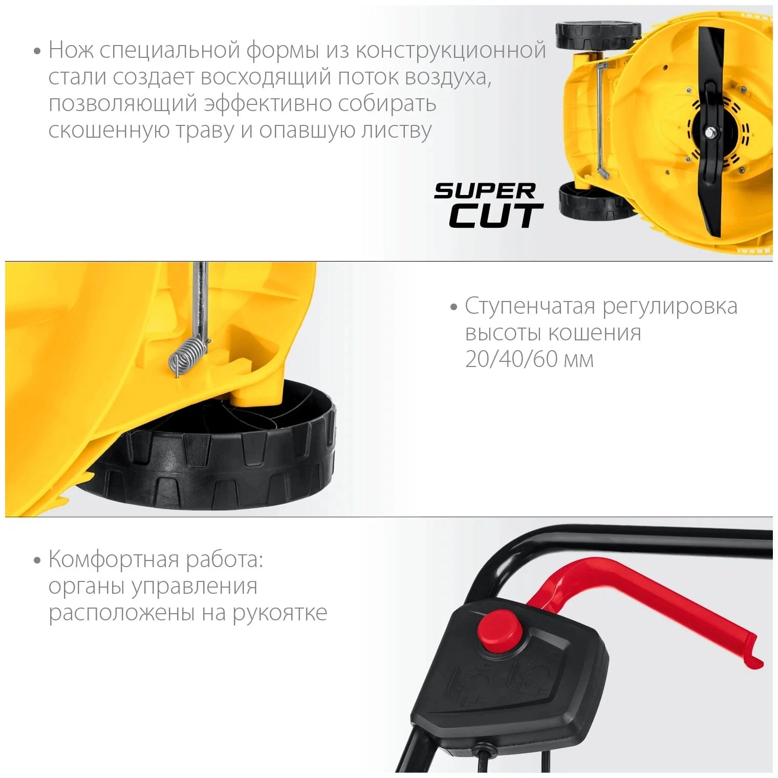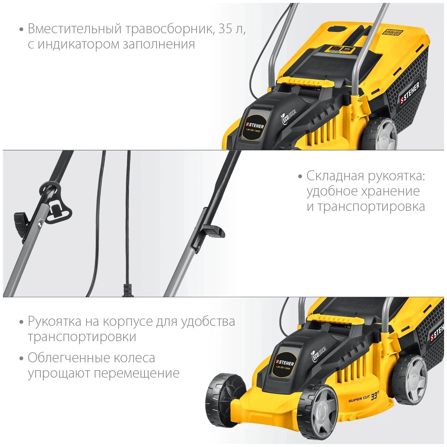ХарактеристикиАртикул LM-33-1300Бренды STEHERСтрана производства КитайТип электрическаяСамоходная нетМульчирование нетШирина скашивания 33Высота травы после стрижки, мм (мин-макс) 20-60Число оборотов холостого хода 3300Материал корпуса пластикКоличество ступеней 3Объем травосборника, л 35Тип ручки СкладнаяНапряжение 230 / 50Травосборник естьРегулировка высоты осеваяВес 11Мощность двигателя 1300Двигатель электрическийСамоходная нетОбъём травосборника 35Мульчирование нетТип скашивания сбор в травосборникТравосборник жесткийМин. Высота скашивания 20Регулировка высоты скашивания осеваяМакс. Высота скашивания 60Складная ручка ДаКоличество уровней высоты скашивания 3Скорость вращения ножа 3300Сбор в травосборник ДаЗадний выброс травы ДаОписание товара обновлено 08.12.2025 14:45:47Легкий инструмент для ухода за приусадебным участком. Расширенная функциональность, современный дизайн и простота работы.