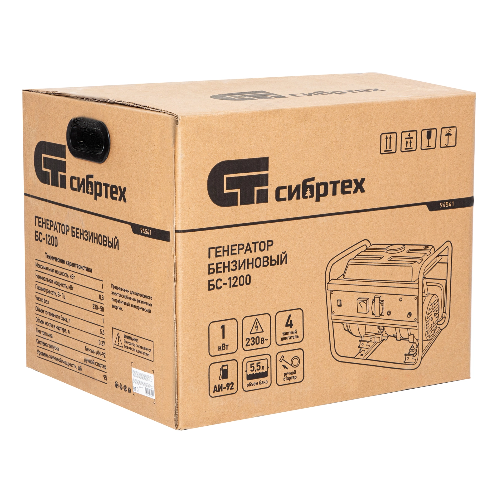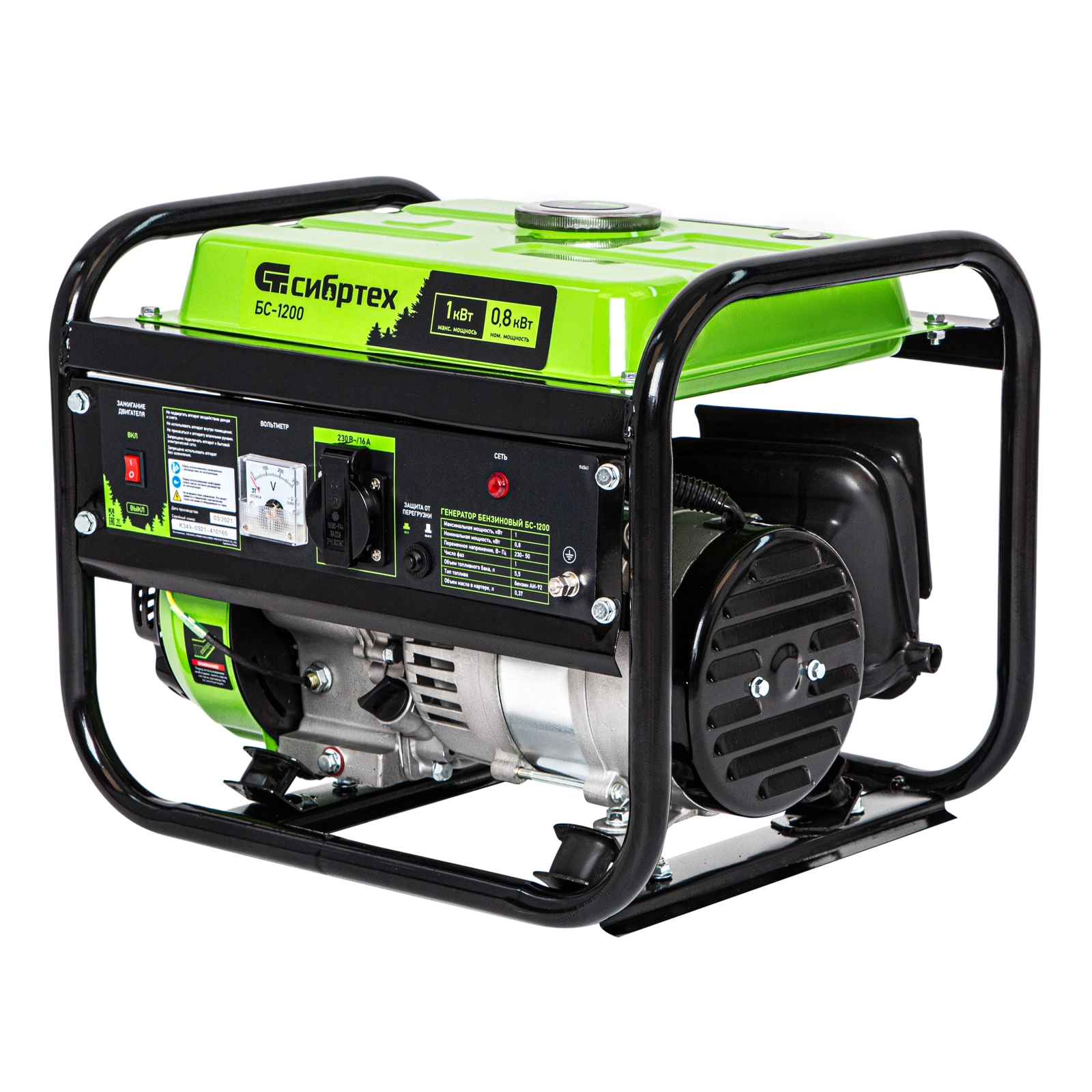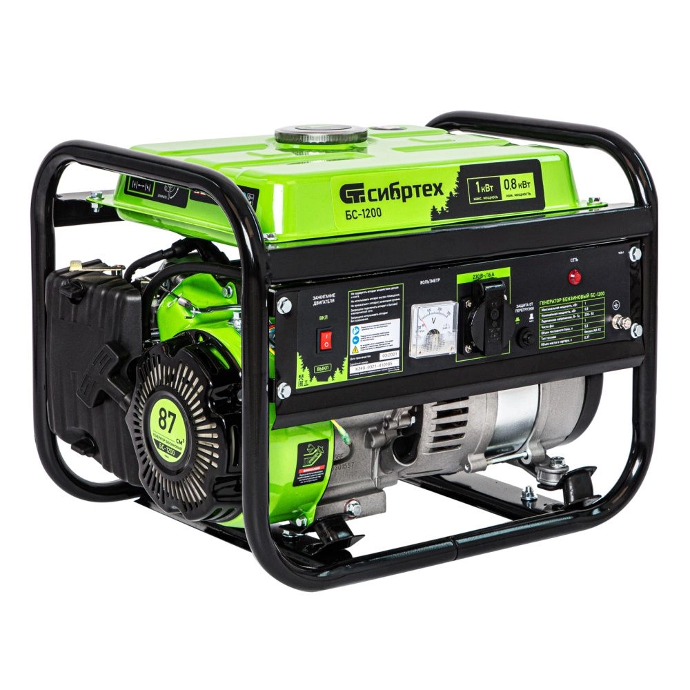 Бензиновый генератор Сибртех БС-1200 94541 на 230 В, максимальной мощностью 1 кВт, с 4-тактным двигателем, с баком на 5,5 л и ручным стартером, может использоваться в качестве простой резервной системы электроснабжения на природе, в мастерской или на даче.