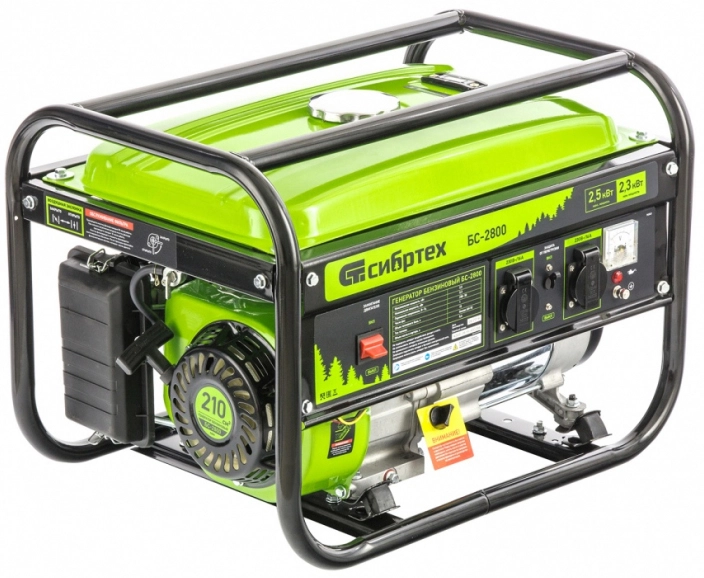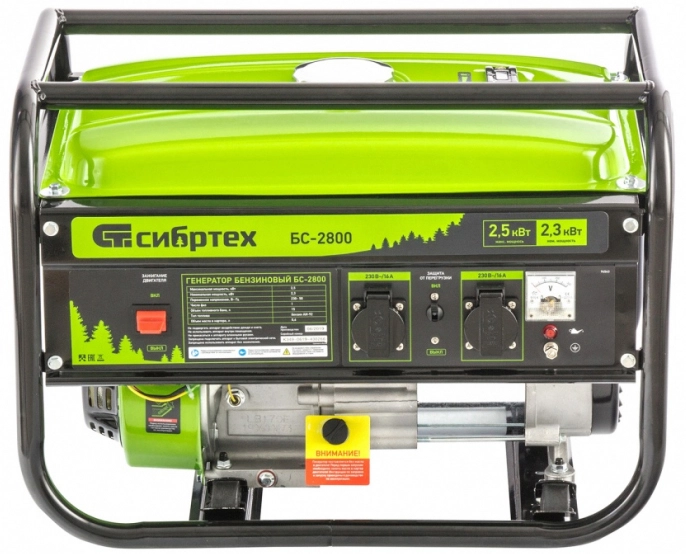 ХарактеристикиАртикул 94543Бренды СИБРТЕХСтрана производства КитайТип бензиновыйСтепень защиты IP23Объём двигателя 210Вольтметр естьКонструкция двигателя четырехтактныйИсполнение открытоеЁмкость топливного бака 15Число фаз 1Максимальная активная мощность 2.3Запуск ручнойВес 39.6Расход топлива 1.25Максимальная полная мощность 2.5Время работы на полном баке (при нагрузке 75%) 12Длина 605Ширина 440Высота 440Используемое топливо бензинВходное напряжение 220Описание товара обновлено 08.12.2025 15:31:00Бензиновый генератор Сибртех БС-2800 94543 на 230 В, максимальной мощностью 2,5 кВт, с 4-тактным двигателем и баком объемом 15 л, подходит для использования на даче, в гараже, мастерской или на стройке.
