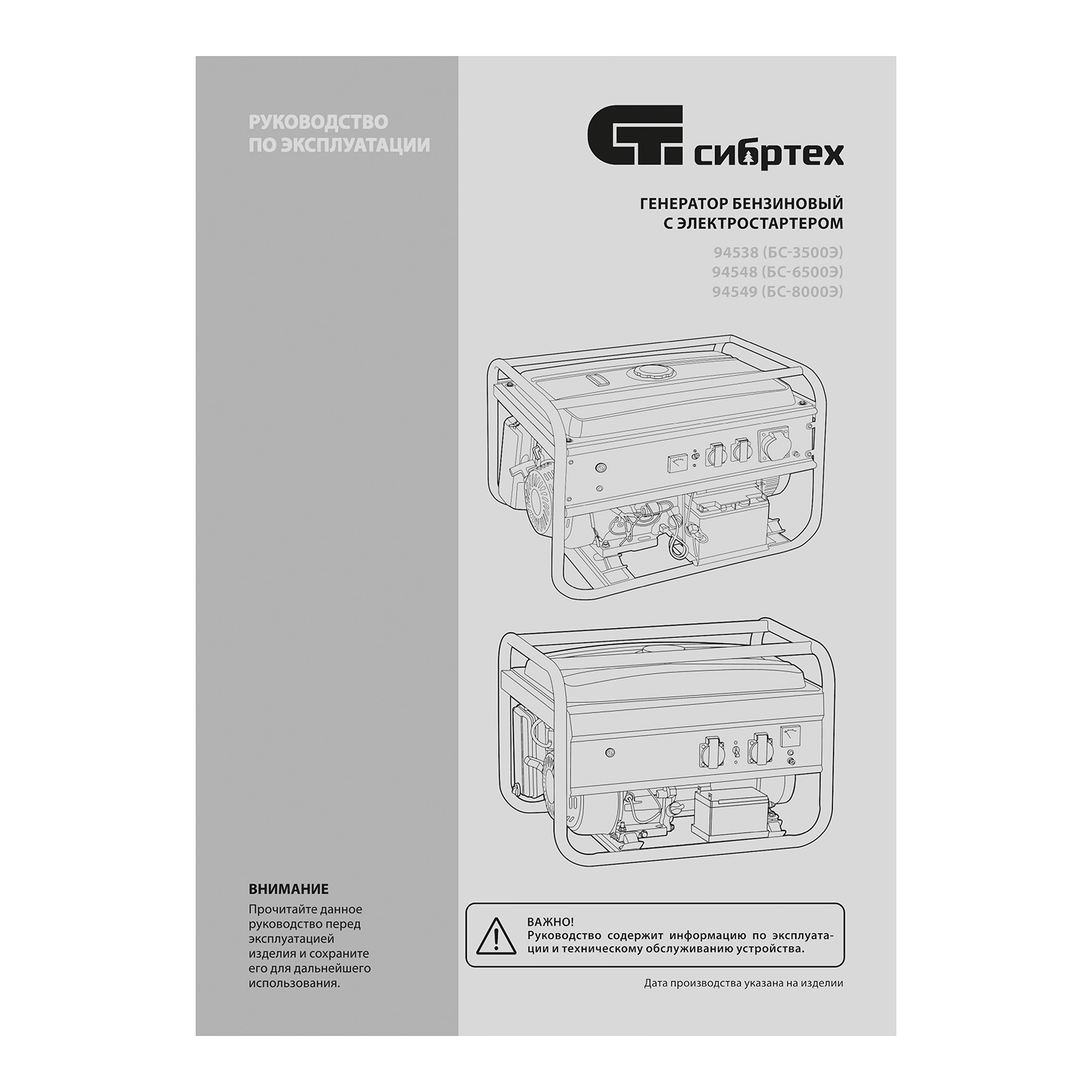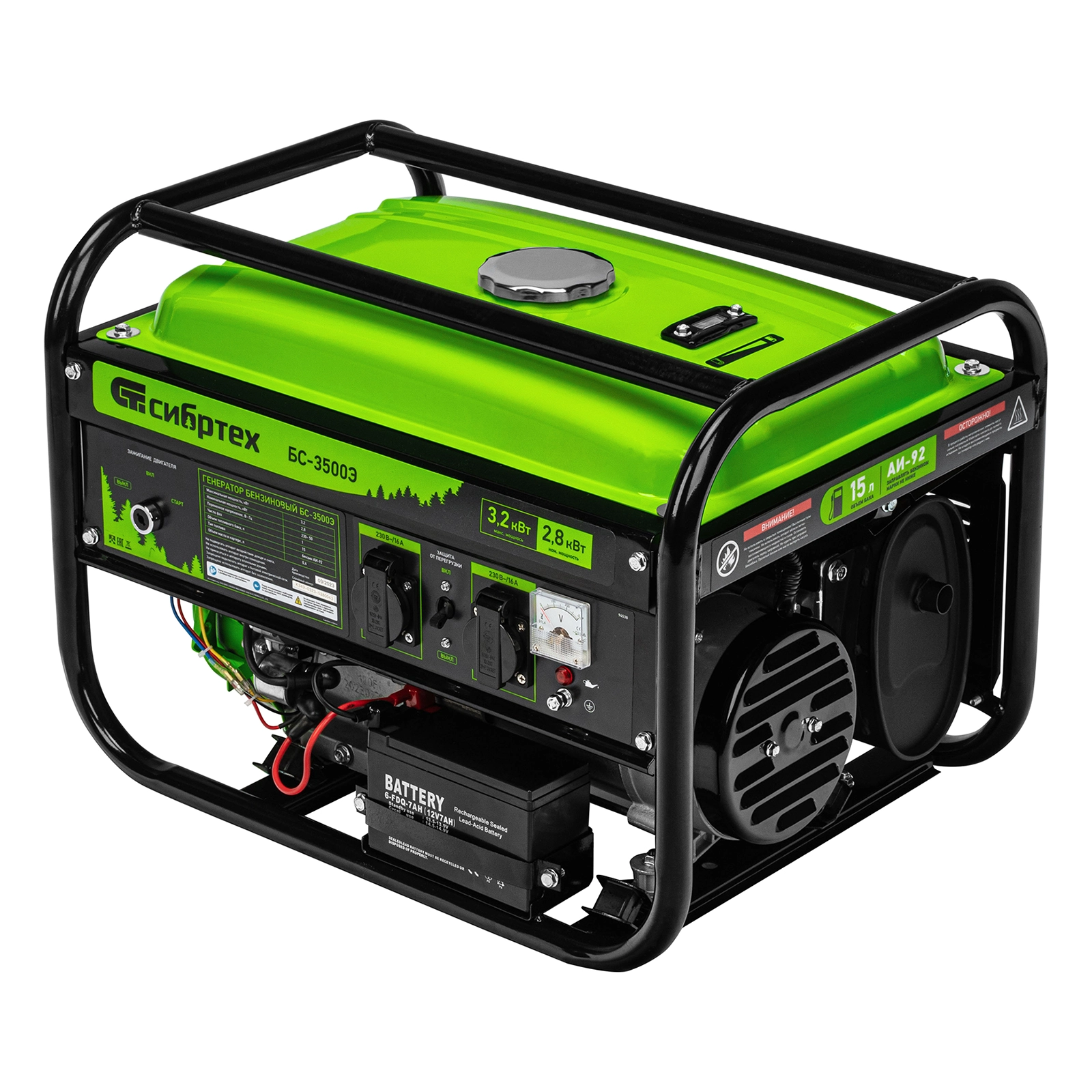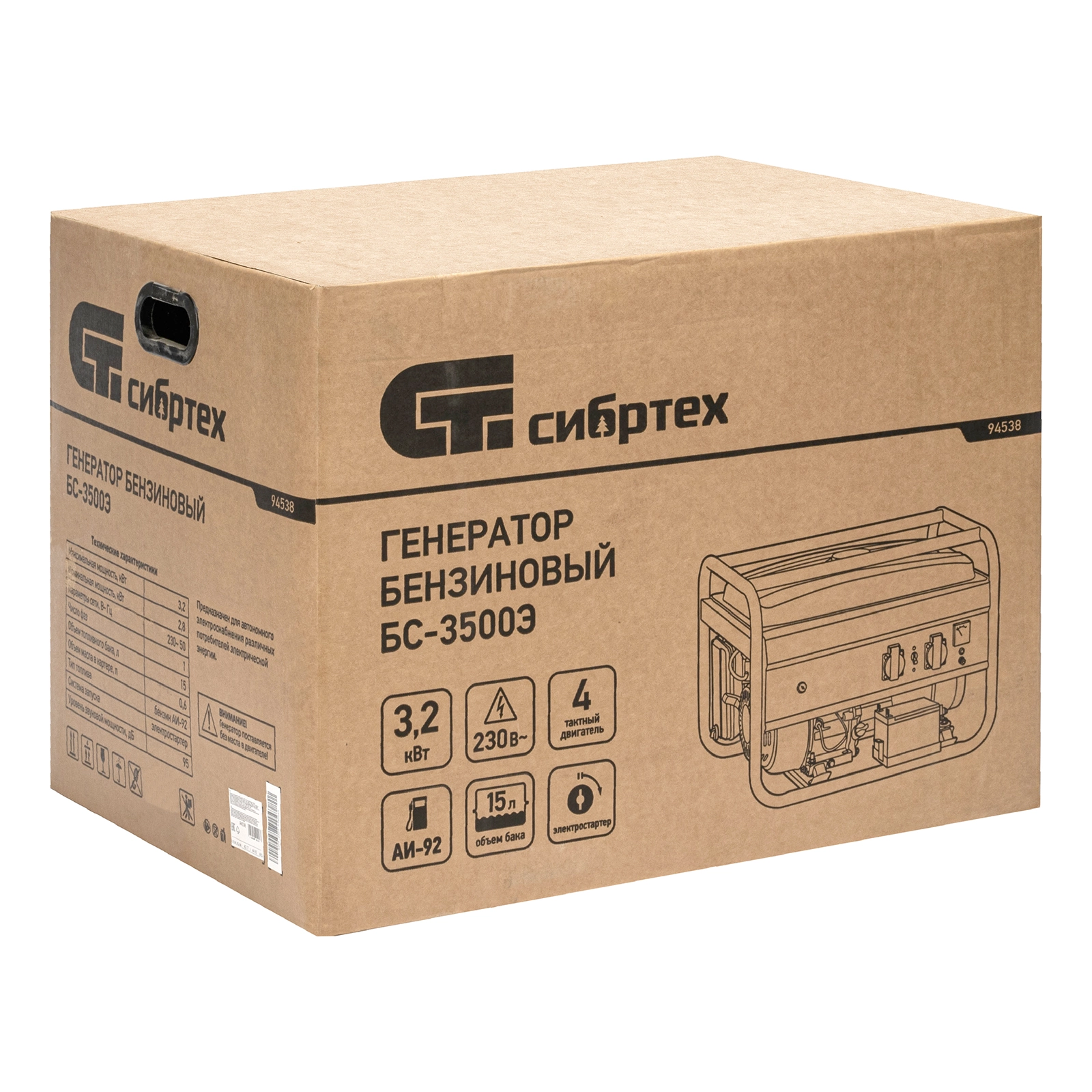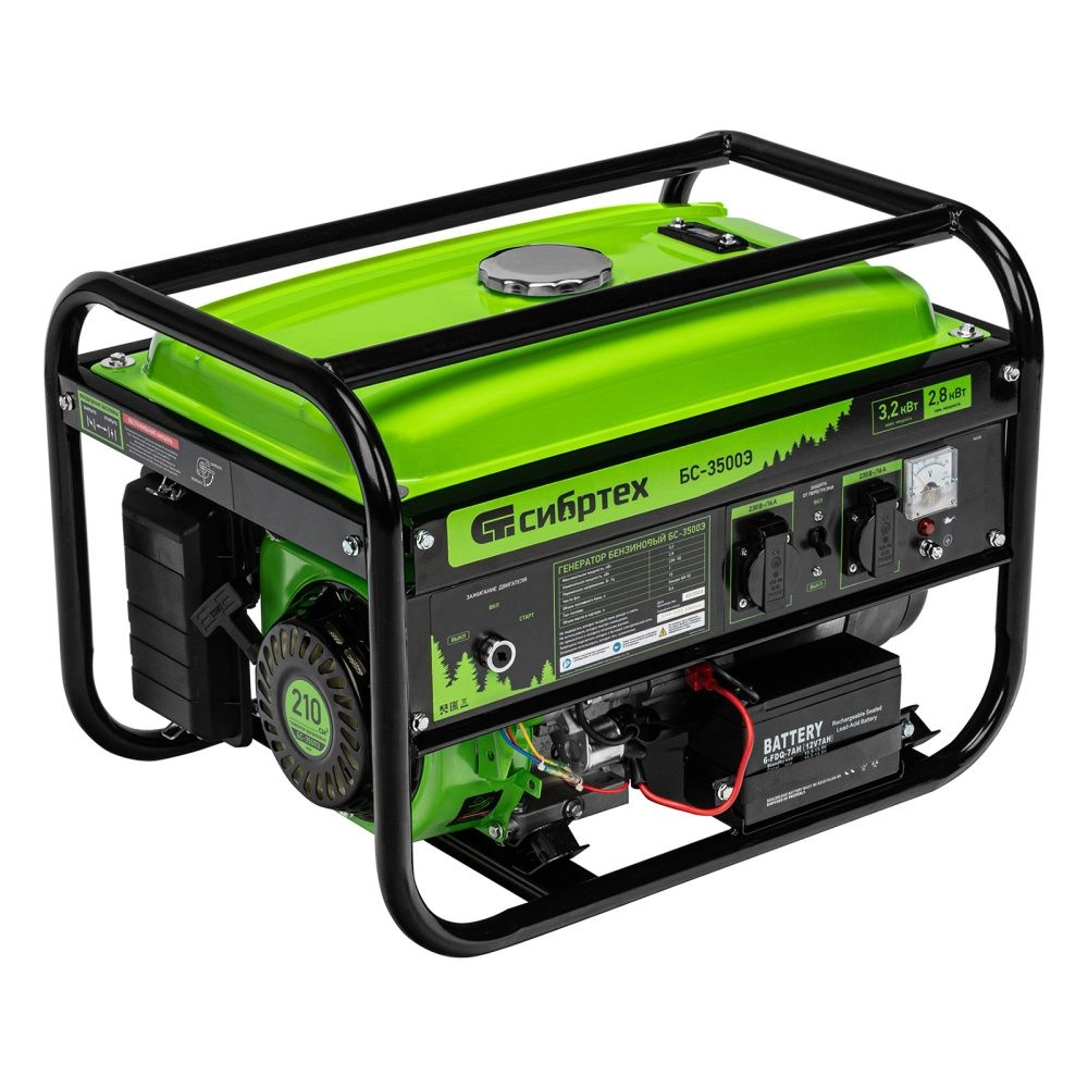 ПроизводителиГенератор бензиновый БС-3500Э, 3,2 кВт, 230В, 15 л, электростартер Сибртех