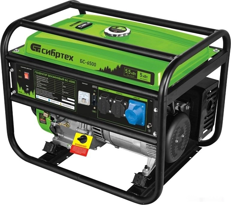 ХарактеристикиАртикул 94546Бренды СИБРТЕХСтрана производства КитайТип бензиновыйОбъём двигателя 420Охлаждение воздушноеЗащита от перегрузки 2405Индикатор уровня топлива ДаВольтметр естьТип генератора синхронныйИсполнение открытоеЧисло фаз 1Максимальная активная мощность 5.5Запуск ручнойНоминальная активная мощность 5Выход постоянного тока нетВремя непрерывной работы 9.6Расход топлива 2.6Длина 550Уровень шума 95Ширина 525Высота 690Описание товара обновлено 08.12.2025 14:49:52Бензиновый генератор Сибртех БС-6500 94546 на 230 В, с 4-тактным двигателем, баком на 25 л и ручным стартером, выдает 5,5 кВт и подходит для создания целой электросети в загородном доме, магазине, мастерской или на строительной площадке.