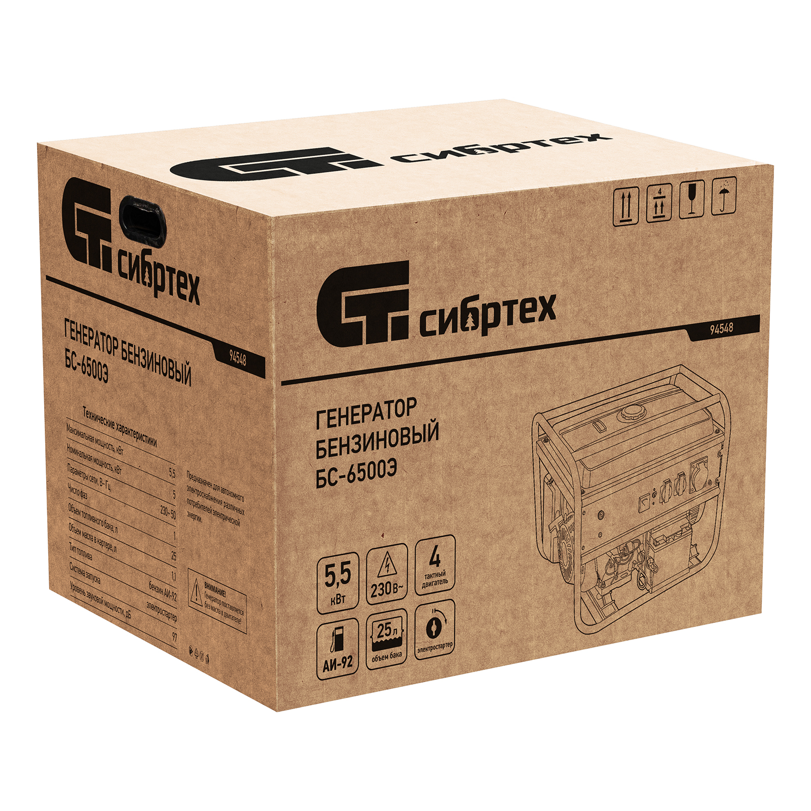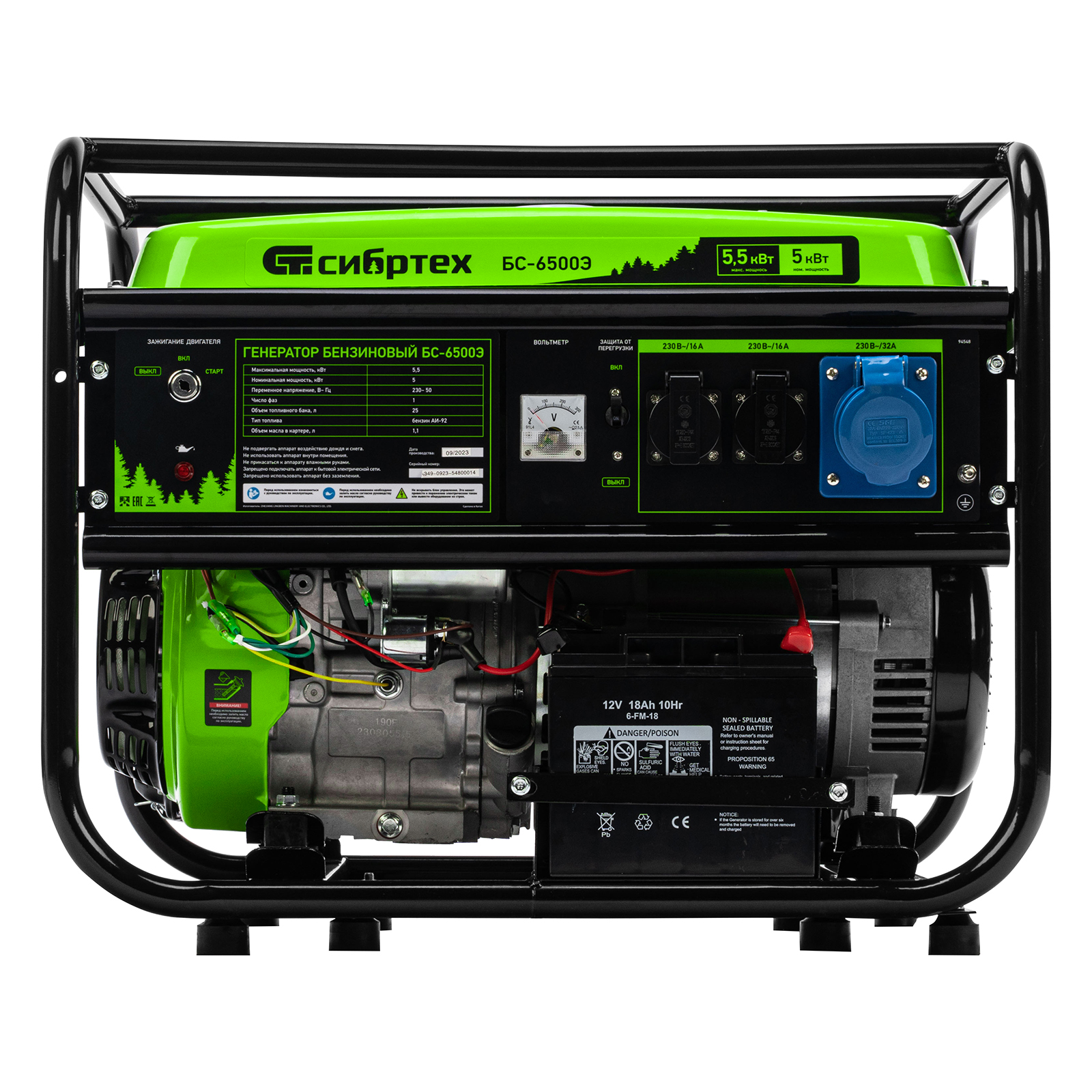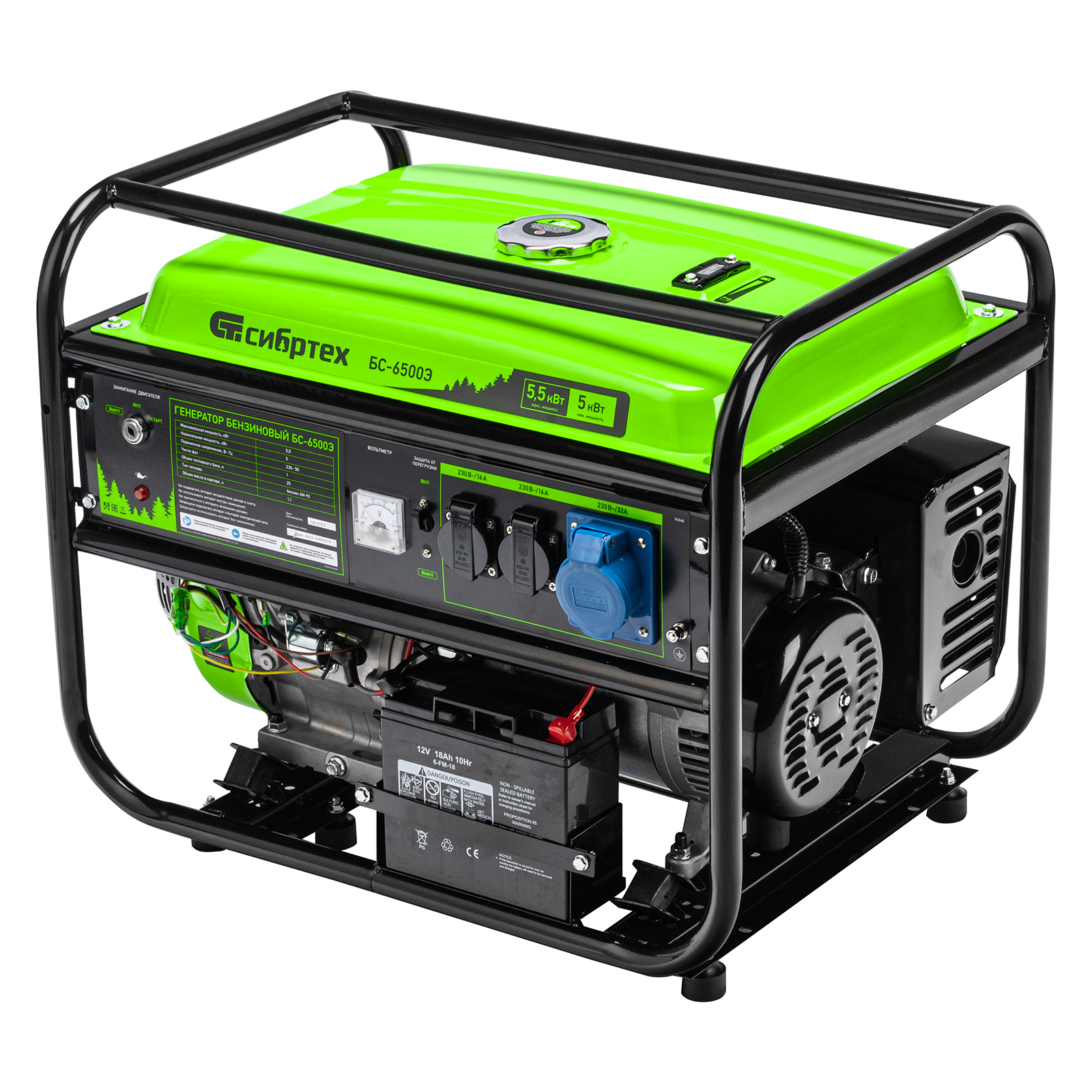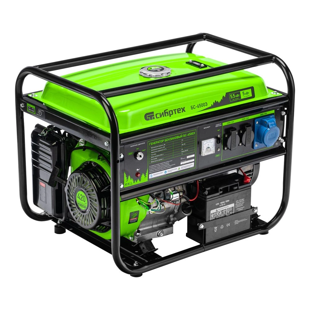 Бензиновый генератор Сибртех БС-6500Э 94548 максимальной мощностью 5,5 кВт, с 4-тактным двигателем, электростартером и баком объемом 25 л, выдает напряжение 230 В и используется для электроснабжения на даче, на строительной площадке, в магазине, в мастерской или гараже.