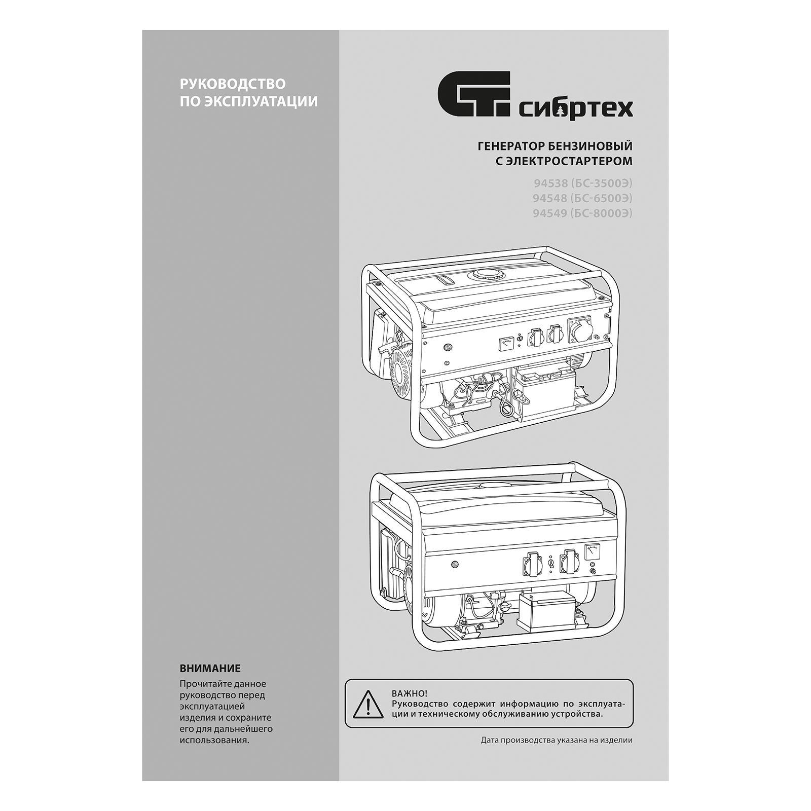 ПроизводителиГенератор бензиновый БС-6500Э, 5,5 кВт, 230В, 4-х такт., 25 л, электростартер Сибртех