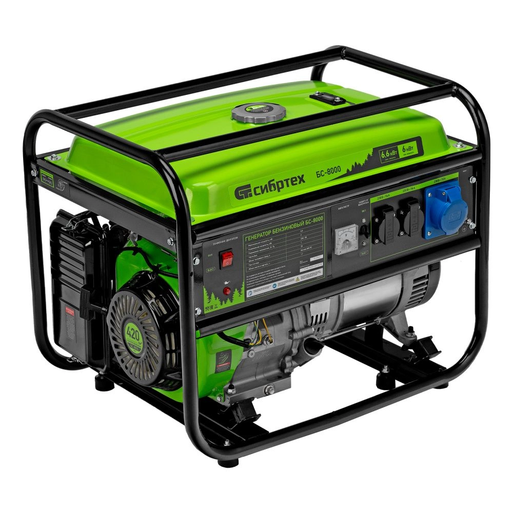 Бензиновый генератор Сибртех БС-8000 94547 на 230 В, с 4-тактным двигателем, с ручным стартером и баком объемом 25 л, вырабатывает 6,6 кВт и отлично подойдет для дачи, стройки, торговой палатки, гаража или мастерской.
