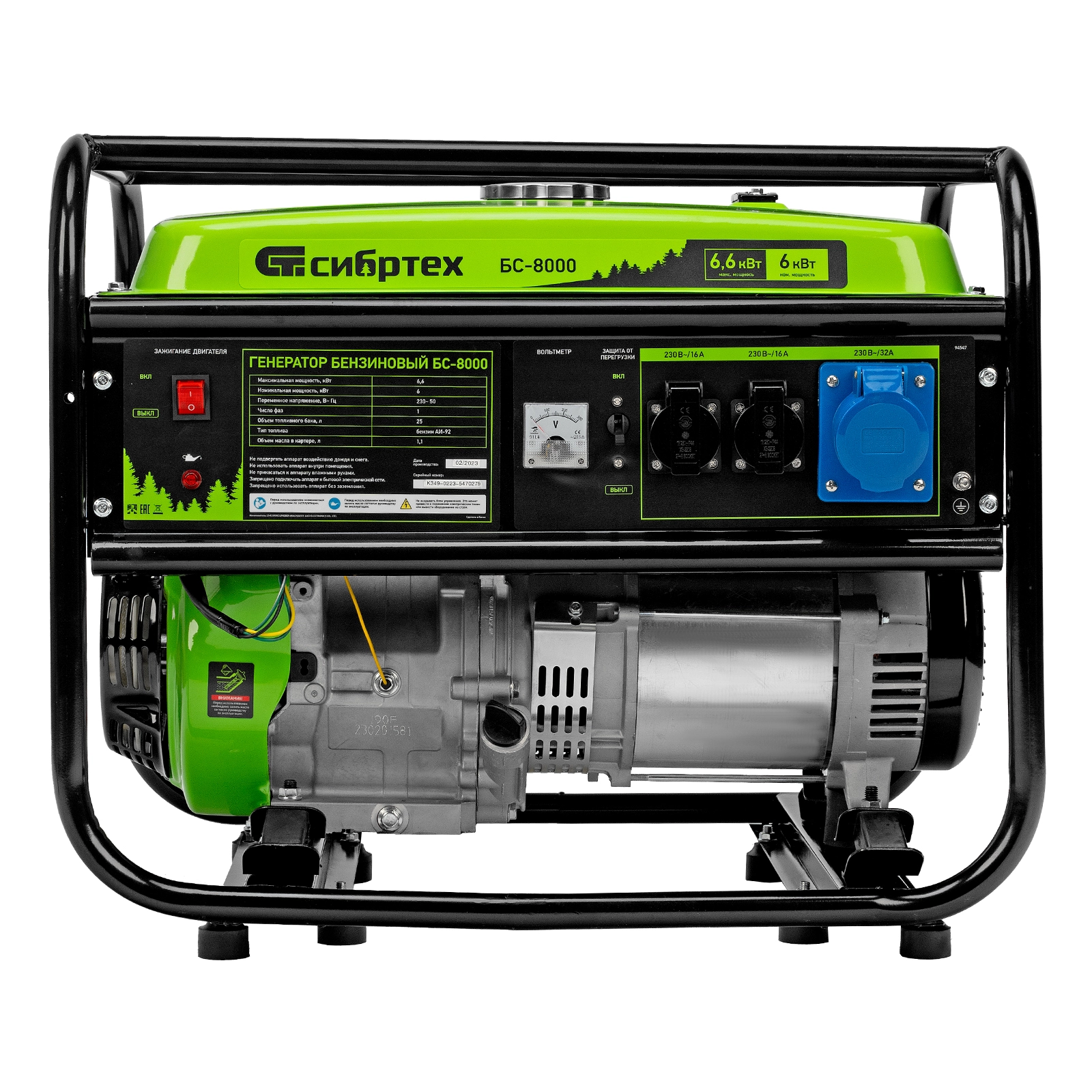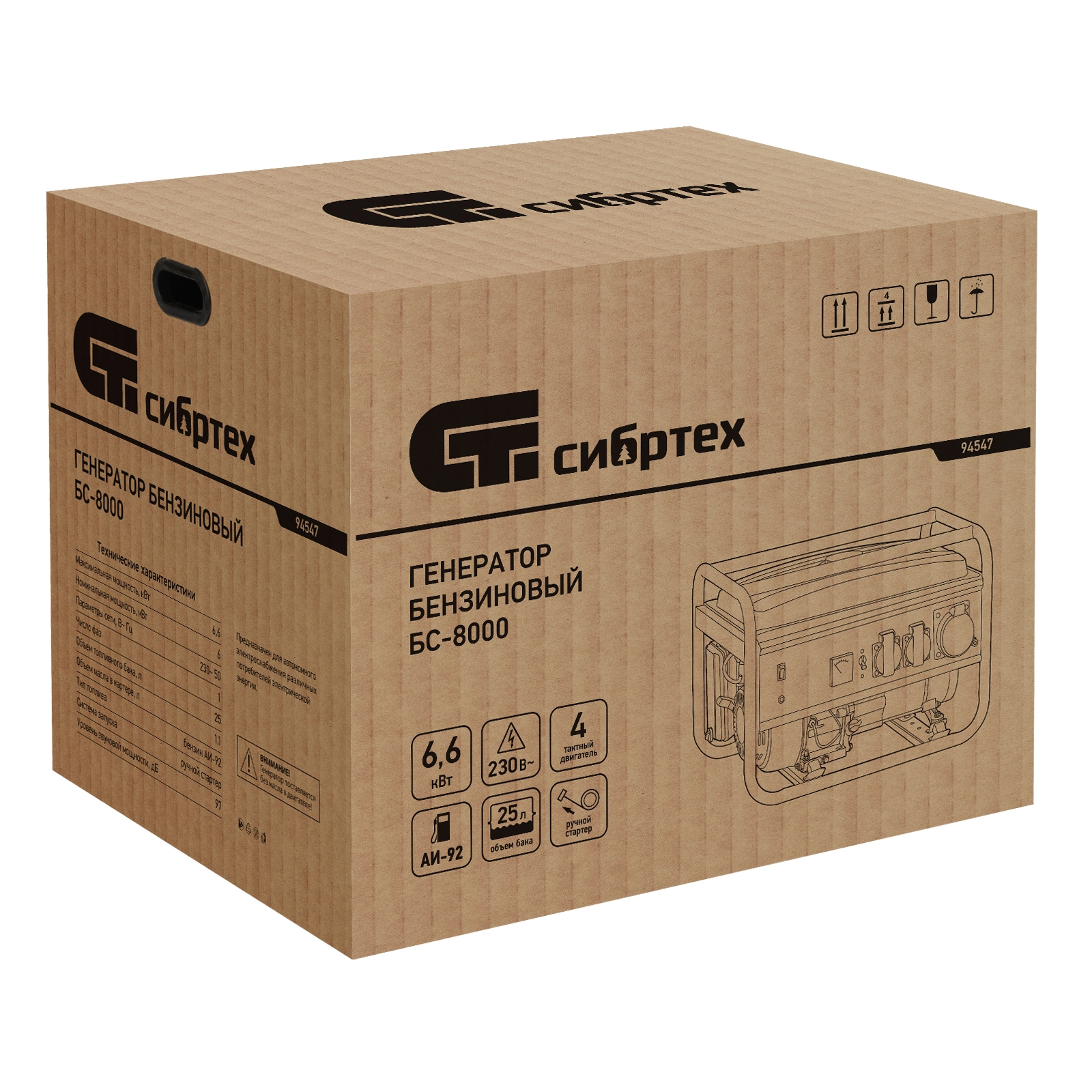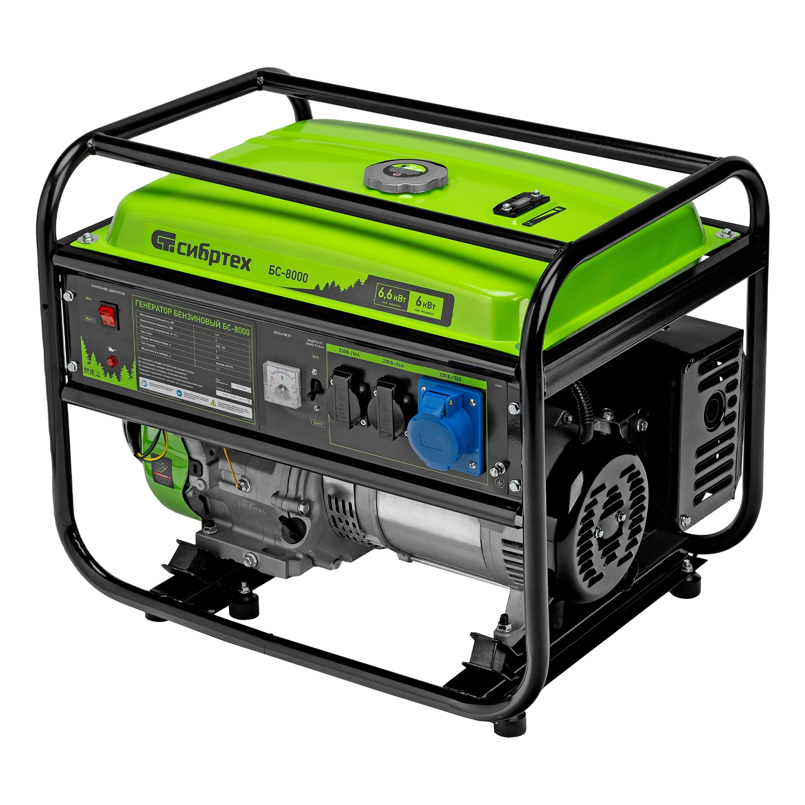 ПроизводителиГенератор бензиновый БС-8000, 6,6 кВт, 230В, 4-х такт., 25 л, ручной стартер Сибртех