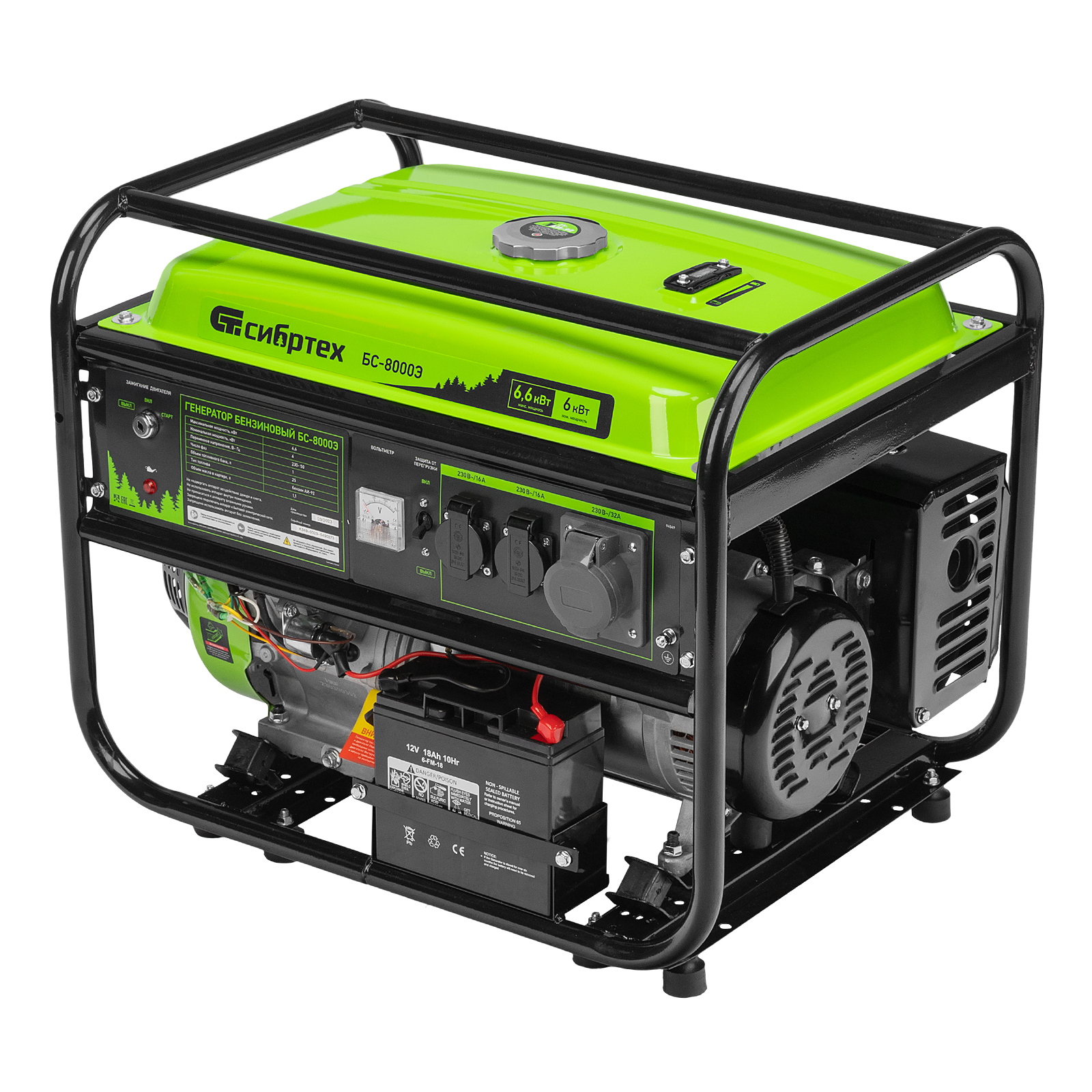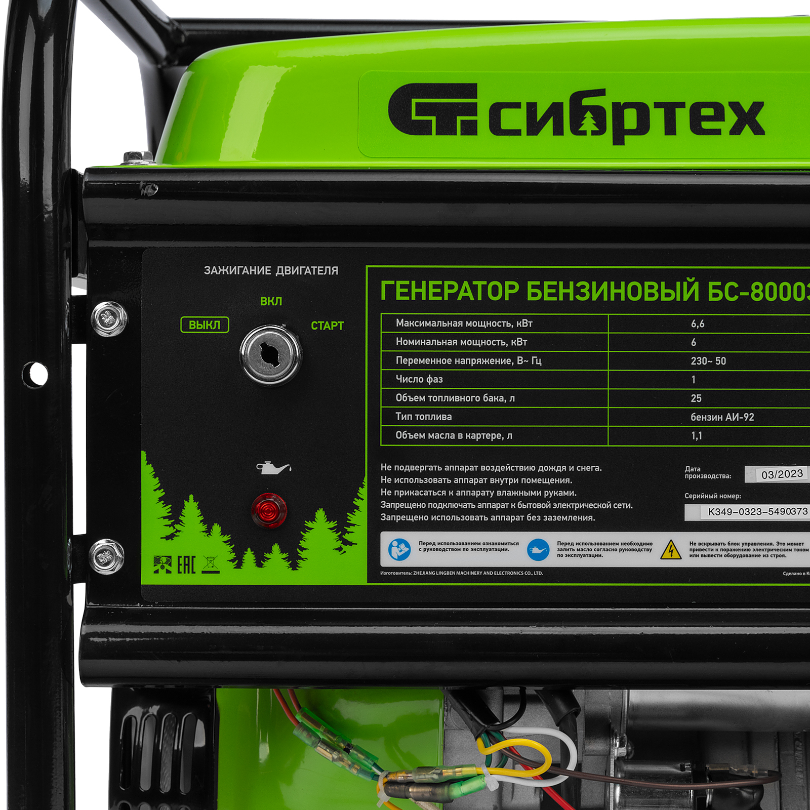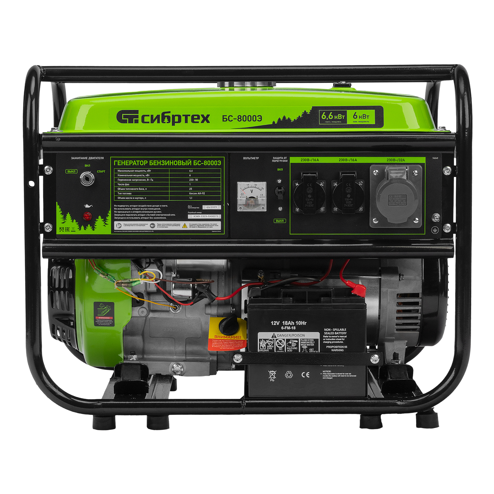 ПроизводителиГенератор бензиновый БС-8000Э, 6,6 кВт, 230В, 4-х такт., 25 л, электростартер Сибртех
