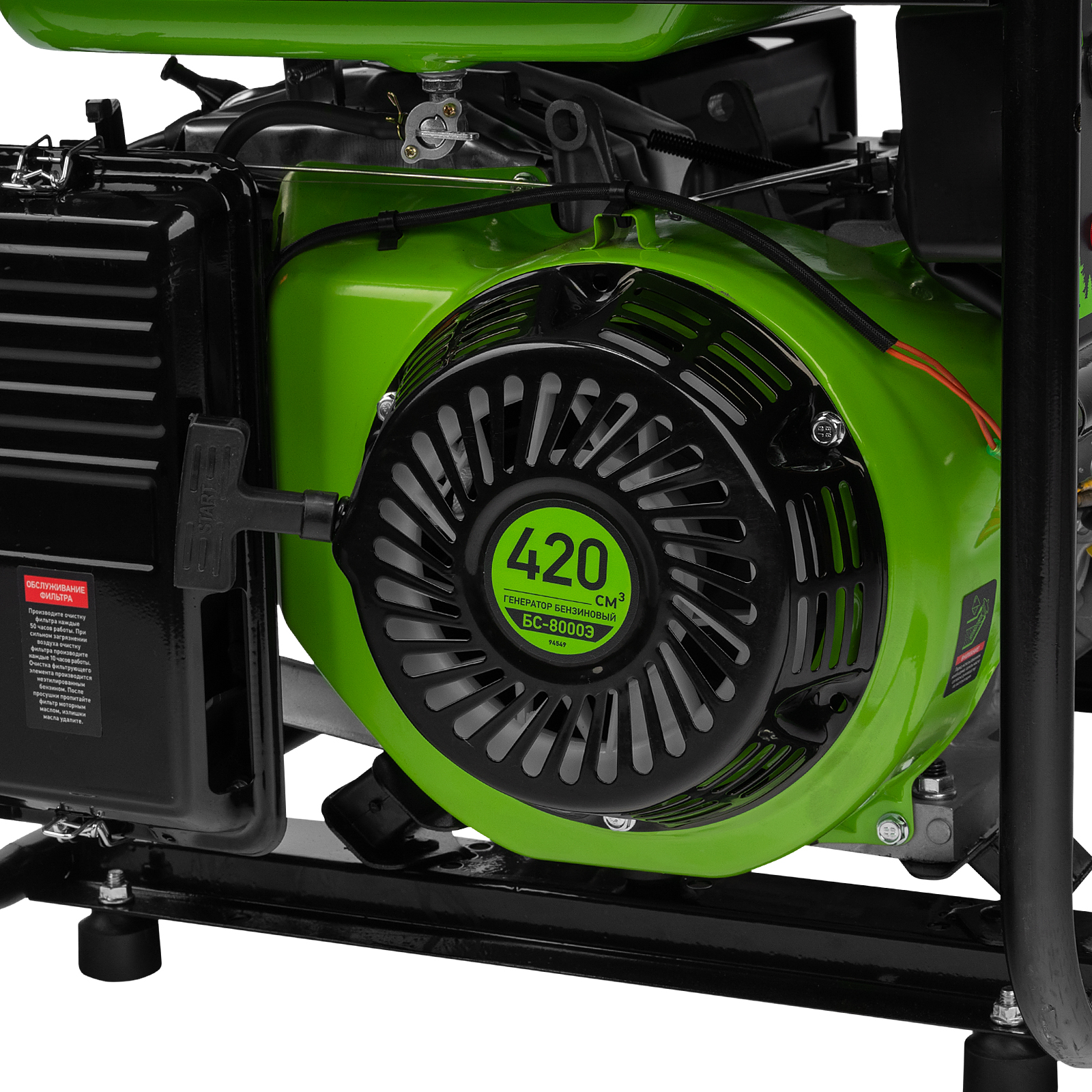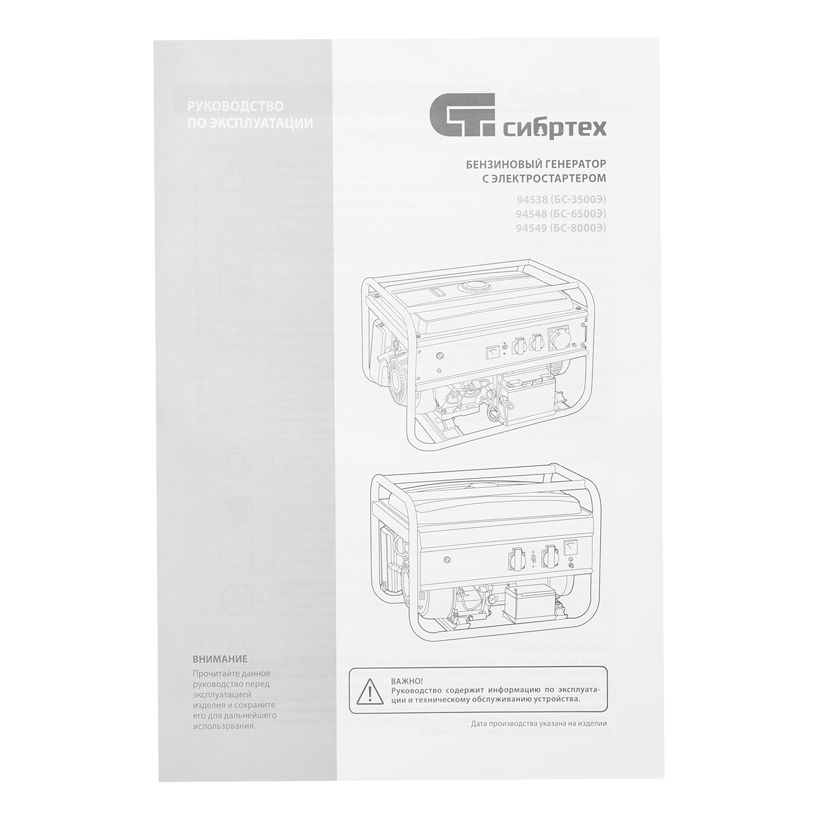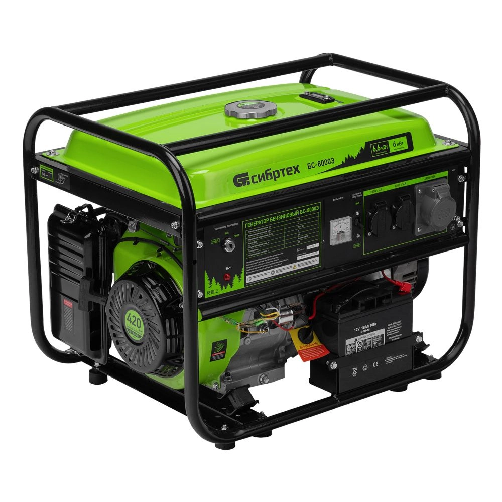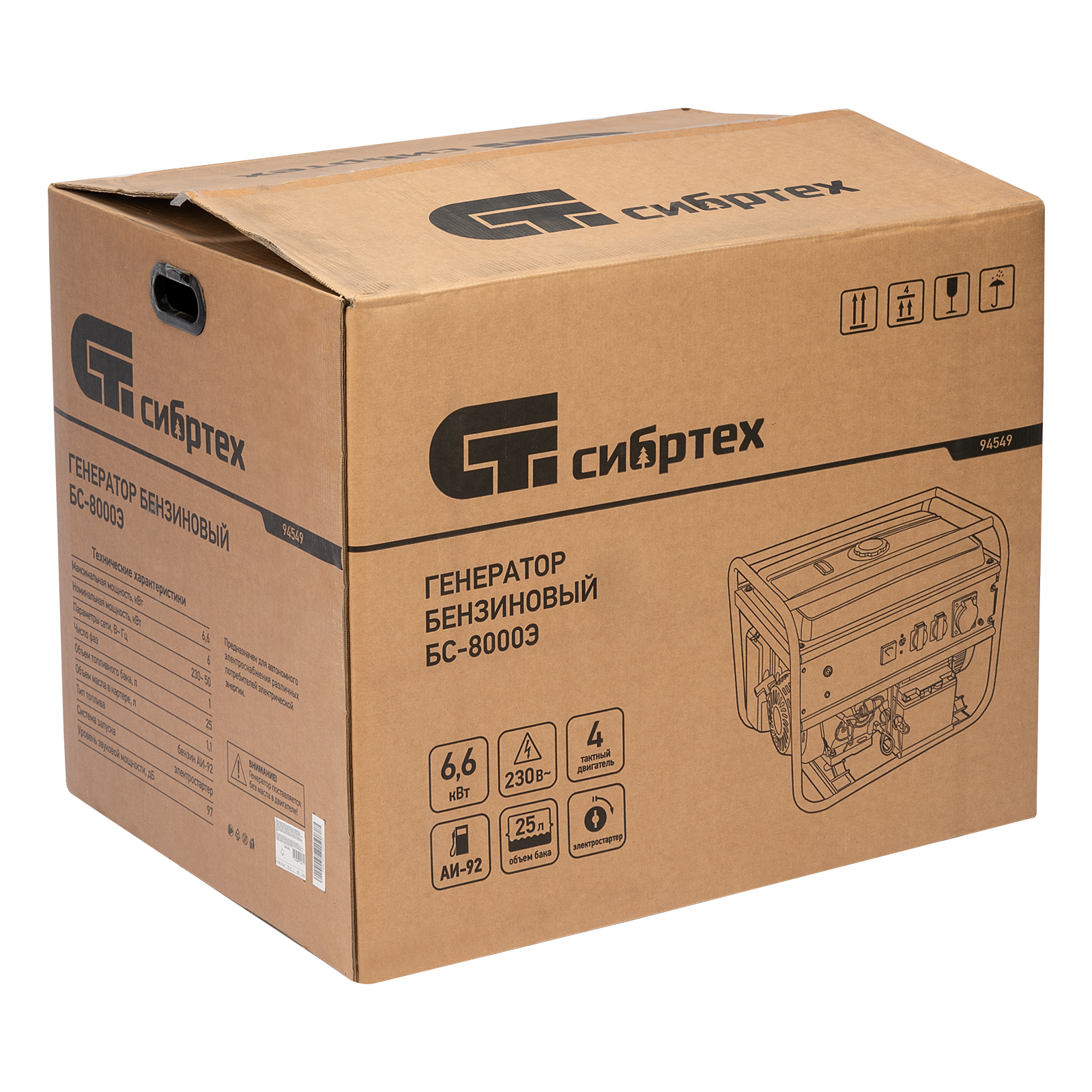 ПроизводителиГенератор бензиновый БС-8000Э, 6,6 кВт, 230В, 4-х такт., 25 л, электростартер Сибртех