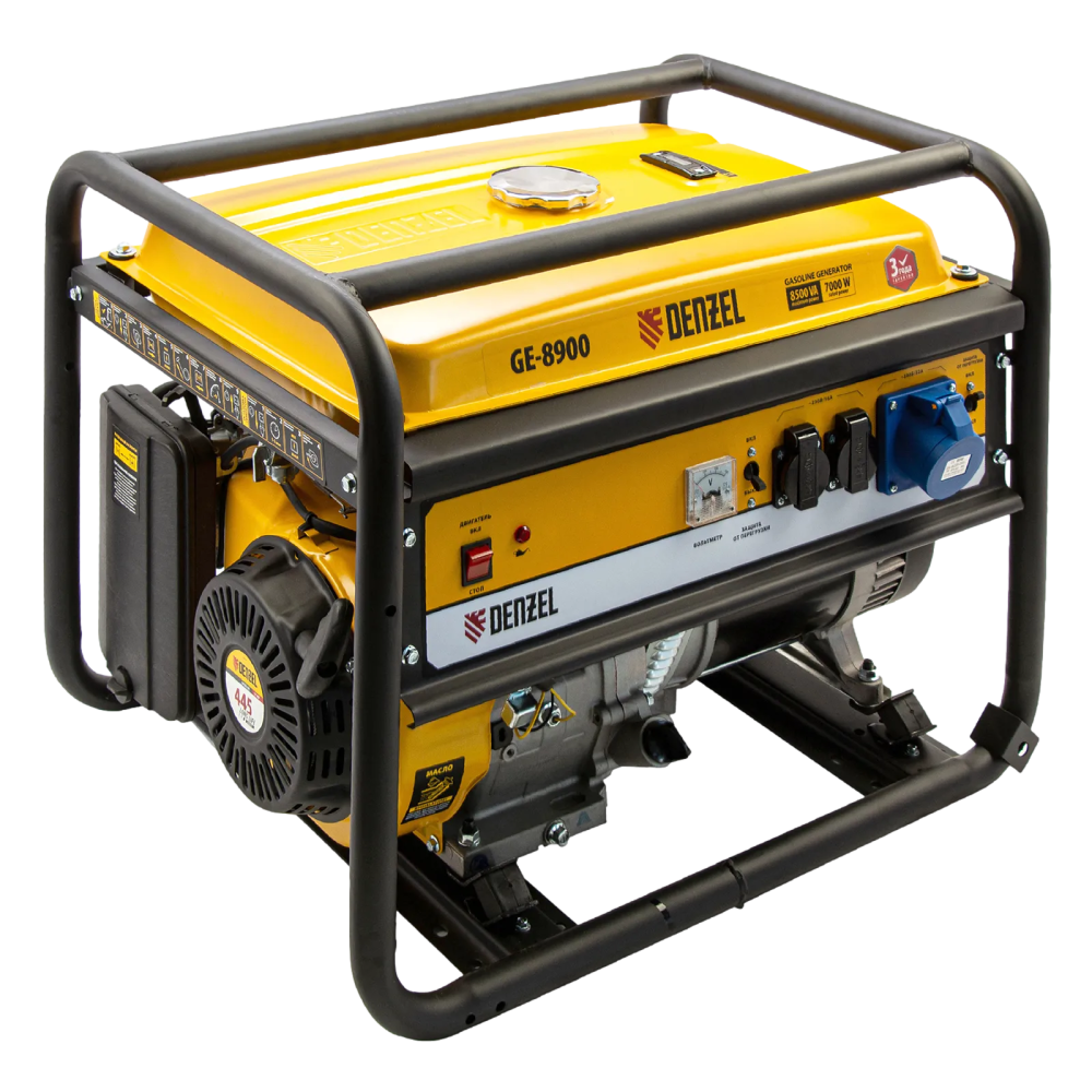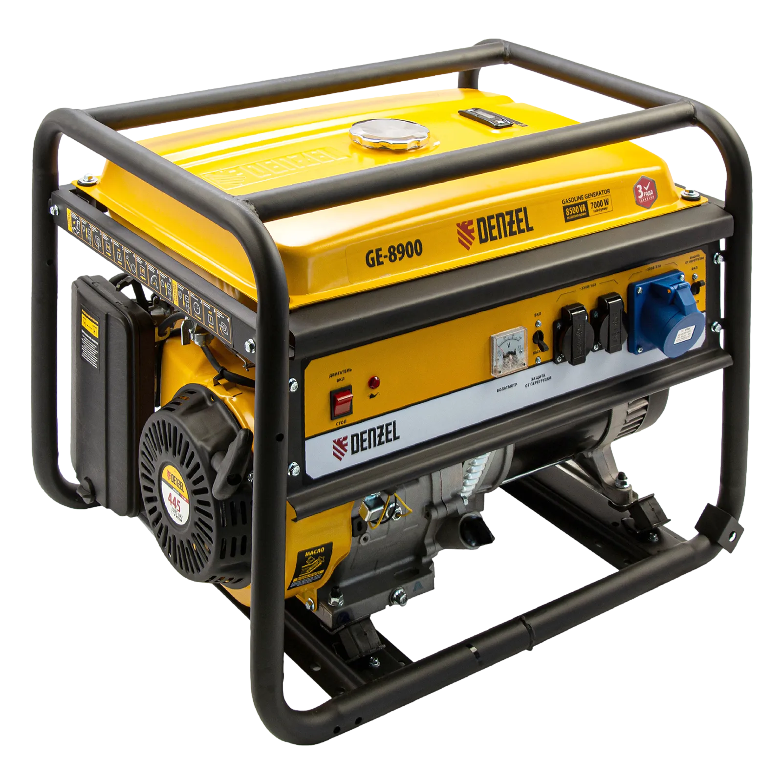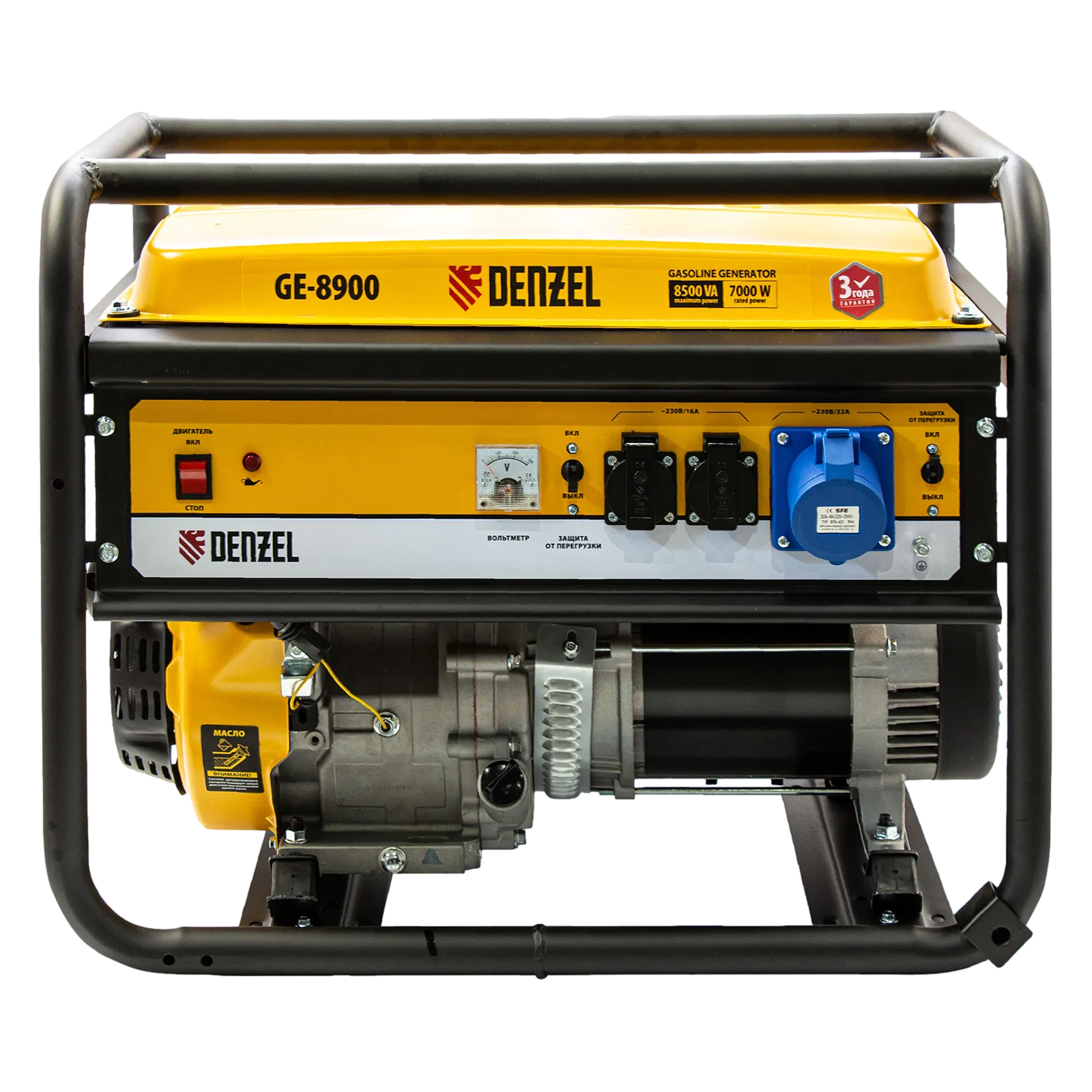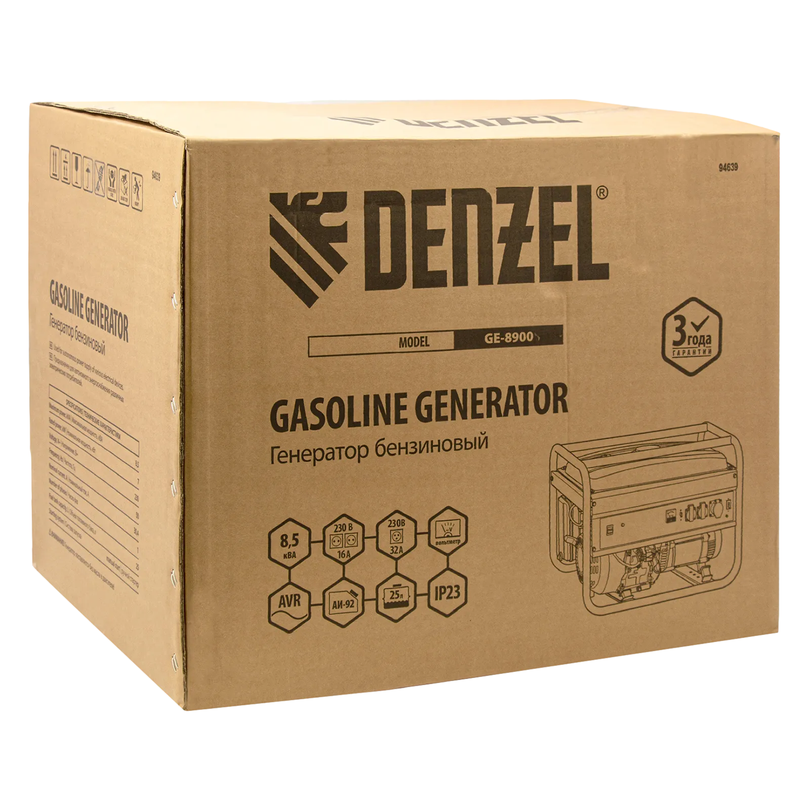 Бензиновый генератор Denzel GE 8900 94639, 220 В / 50 Гц, с баком на 25 л и ручным стартом, вырабатывает 8,5 кВт и способен обеспечить электричеством большой загородный дом, магазин или строительную площадку.
