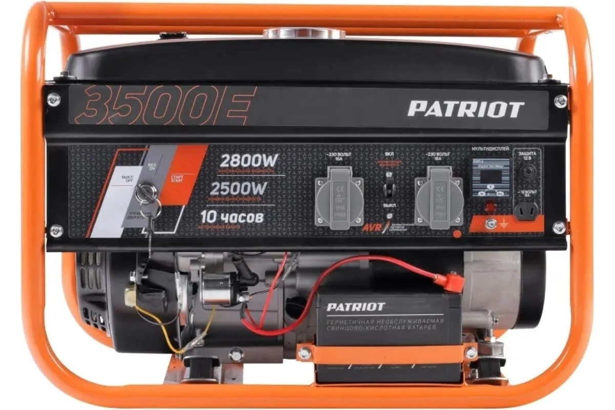 ЭКОНОМУровень качества. При классификации продуктов, имеющих схожее наименование, но обладающие различными потребительскими свойствами мы приняли следующий Вес факторов: 80% - подтвержденный ресурс, 15% - заявленная производительность/скорость, 5% - субъективные ощущения потребителя. ПодробнееКод товара: 0074063(0)ХарактеристикиАртикул 476102250Бренды PATRIOTСтрана производства КитайГарантия 12 месяцевГабариты (ШхВхГ),мм 610х450х450Тип бензиновыйРасход топлива, л/час 1,9Объем топливного бака, л 15Мощность, л.с. 7Число оборотов холостого хода 3000Цвет оранжевый/черныйКоличество розеток 3Материал корпуса металлСтепень защиты IP21Объём двигателя 212Двигатель/Тактность 4-х тактныйМетод изготовления корпуса открытыйНапряжение 230 / 12Объем масляного бака, л 0,6Тип топлива бензин АИ-92Стартер Ручной, электро + АКБСвеча зажигания F7ТС, F7RTCОхлаждение воздушноеВоздушный фильтр поролоновый картриджНаличие дисплея естьЗащита от перегрузки 2405Индикатор уровня топлива естьОбъем масляного картера, л 0,6Выход на 12B есть, розеткаЧастота, Гц 50Количество цилиндров 1Масляный фильтр нетТип альтернатора синхронныйВольтметр естьСчетчик моточасов ДаДатчик уровня масла естьАвтозапуск нетРегулятор напряжения AVRАккумулятор в комплекте даКомплект для транспортировки опцияСила тока розеток 2х230В,16А / 1х12ВАльтернатор СинхронныйВес 25.9Тип генератора синхронныйКонструкция двигателя четырехтактныйМощность двигателя 7Исполнение открытоеЁмкость топливного бака 15Частота напряжения 50Число фаз 1Максимальная активная мощность 2.8Запуск ручной, электростартерВес 25.9Номинальная активная мощность 2.5Расход топлива 1.9Количество розеток 2Индикатор уровня масла ДаЗарядка аккумуляторов (12В) ДаДлина 450Уровень шума 95Объем масленого бака 0.6Ширина 610Количество цилиндров 1Высота 450Ресурс двигателя 10Число оборотов 3000Количество розеток 220 В 2Используемое топливо бензинМодель двигателя Patriot 212ccСила тока 16Стабилизация напряжения АВР (AVR)Материал обмотки алюминийШирина в упаковке 44Высота в упаковке 44Глубина в упаковке 61Ручка для переноски НетОписание товара обновлено 08.12.2025 14:48:37Генератор применяется в качестве аварийного или автономного источника электроэнергии для питания маломощных бытовых электроприборов и электроинструмента. Оптимальное соотношение мощности двигателя и электрогенератора обеспечивает стабильную работу на номинальной мощности. Оснащен двигателем с верхним расположением клапанов [OHV], что значительно увеличивает ресурс, снижает выхлоп и уровень шума. Датчик контроля масла исключает запуск и работу генератора при отсутствии или низком уровне масла в картере. Синхронный электрогенератор с системой автоматической регулировки обеспечивает стабильное выходное напряжение и частоту тока. Электростартер для комфортного запуска генератора. Выход 12 вольт позволяет подзарядить автомобильный аккумулятор в экстренном случае. Усиленная передняя панель с утопленными элементами управления снижает риск механических повреждений.Производитель: 11th Flooor,LiYuanShangdu Building A2,201# LanTian Road,NingBo China