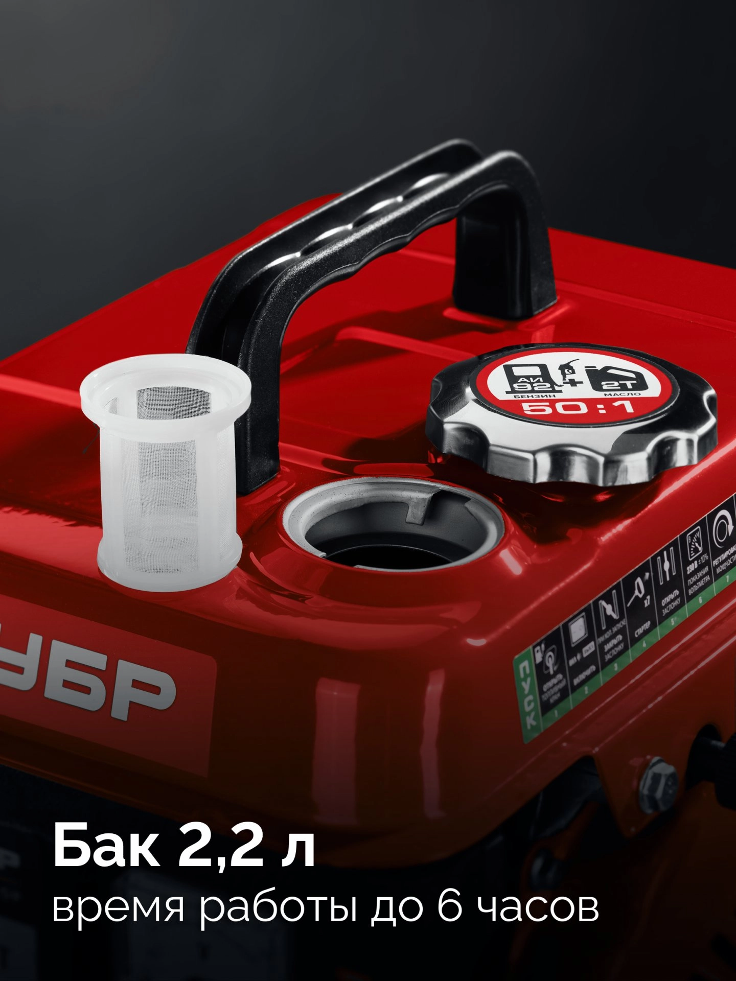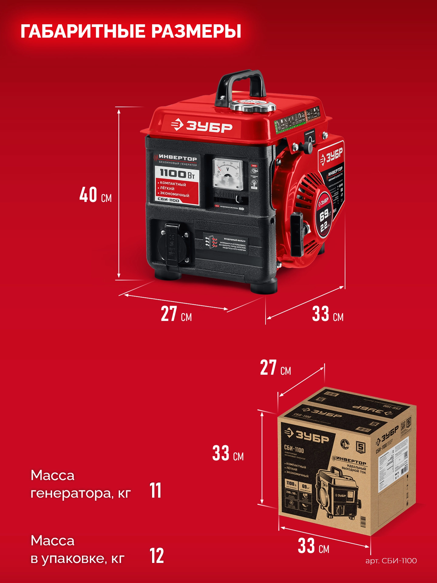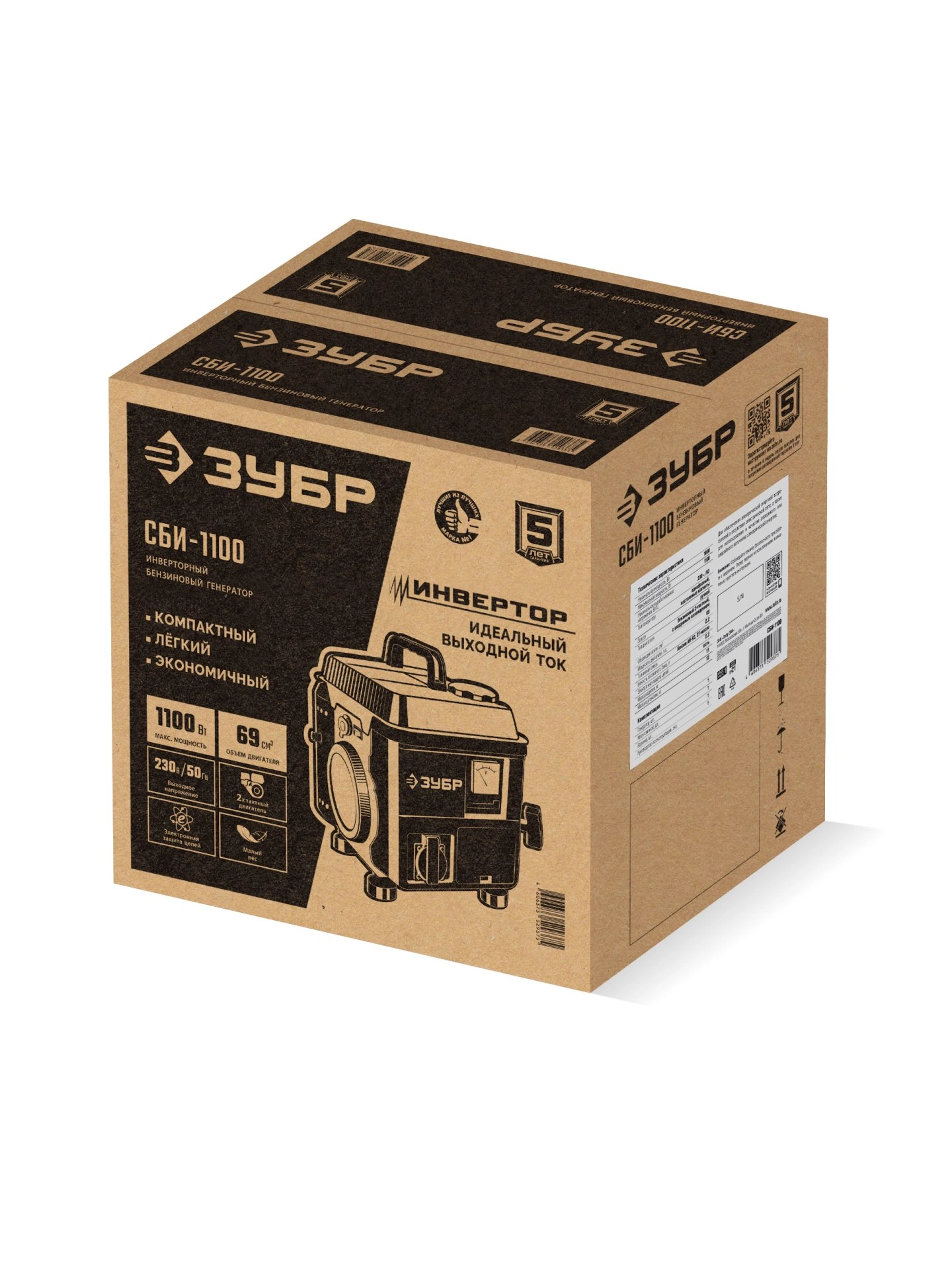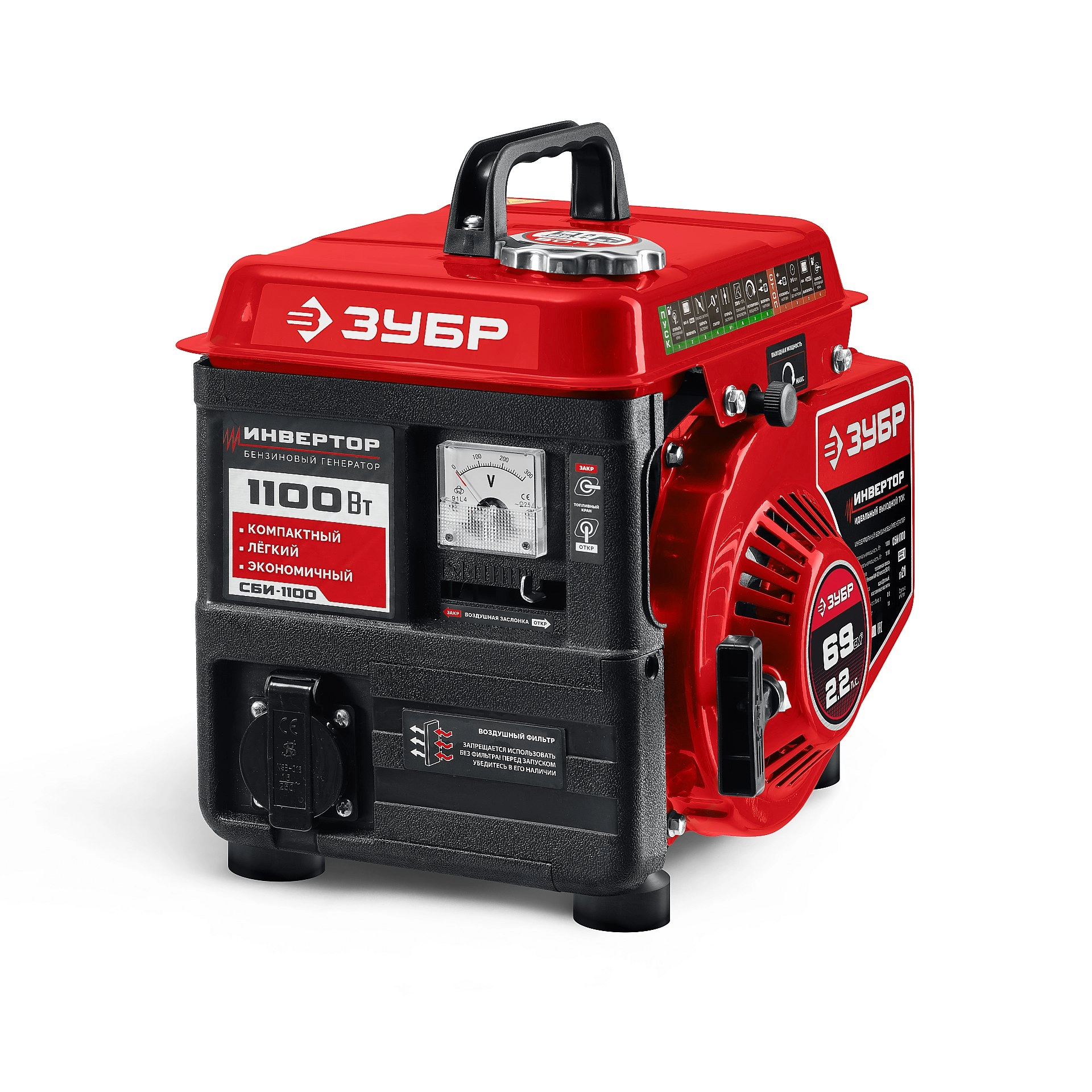 ПроизводителиГенератор бензиновый инверторный компактный СБИ-1100 (1100 Вт, 2.2 л/с, 230/12 В, бак 2.2 л) ЗУБР
