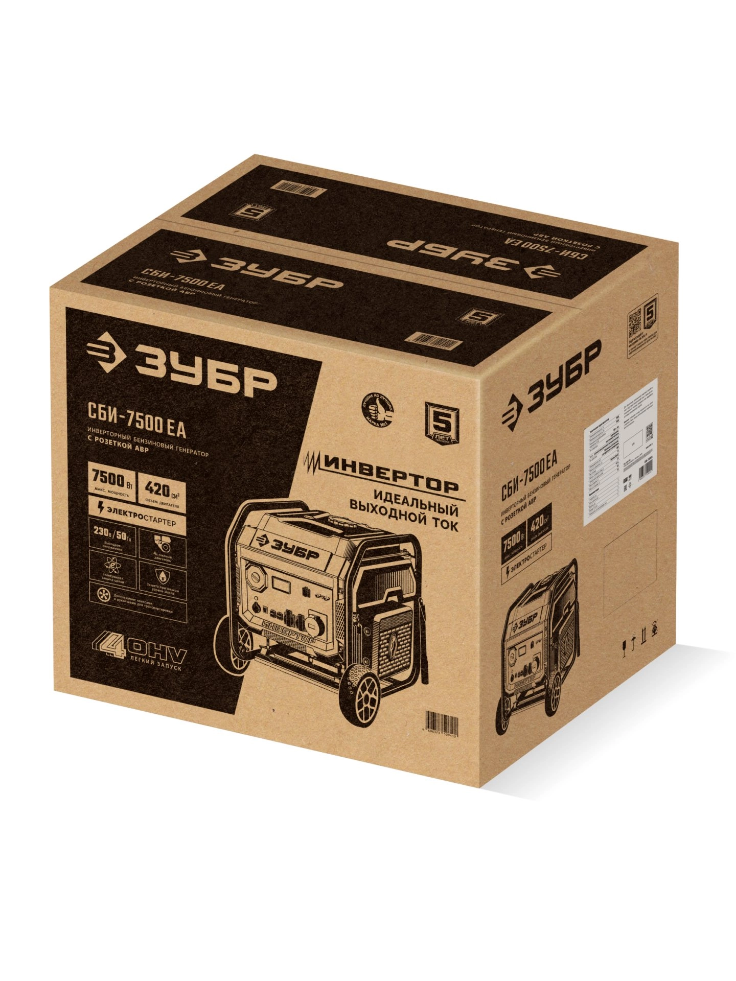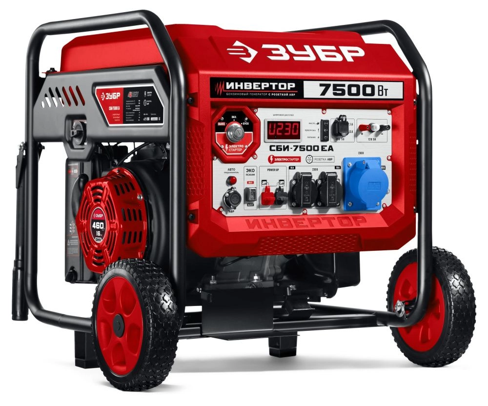 ПроизводителиГенератор бензиновый инверторный СБИ-7500ЕА (7500 Вт, 16 л/с, 230/12/5 В, бак 25 л, розетка) ЗУБР