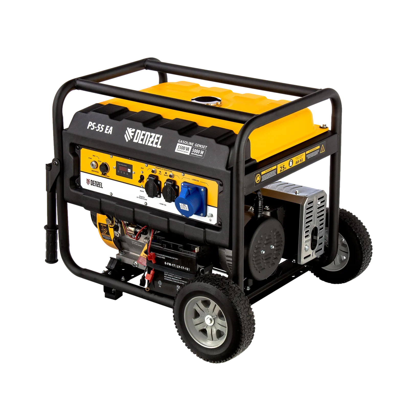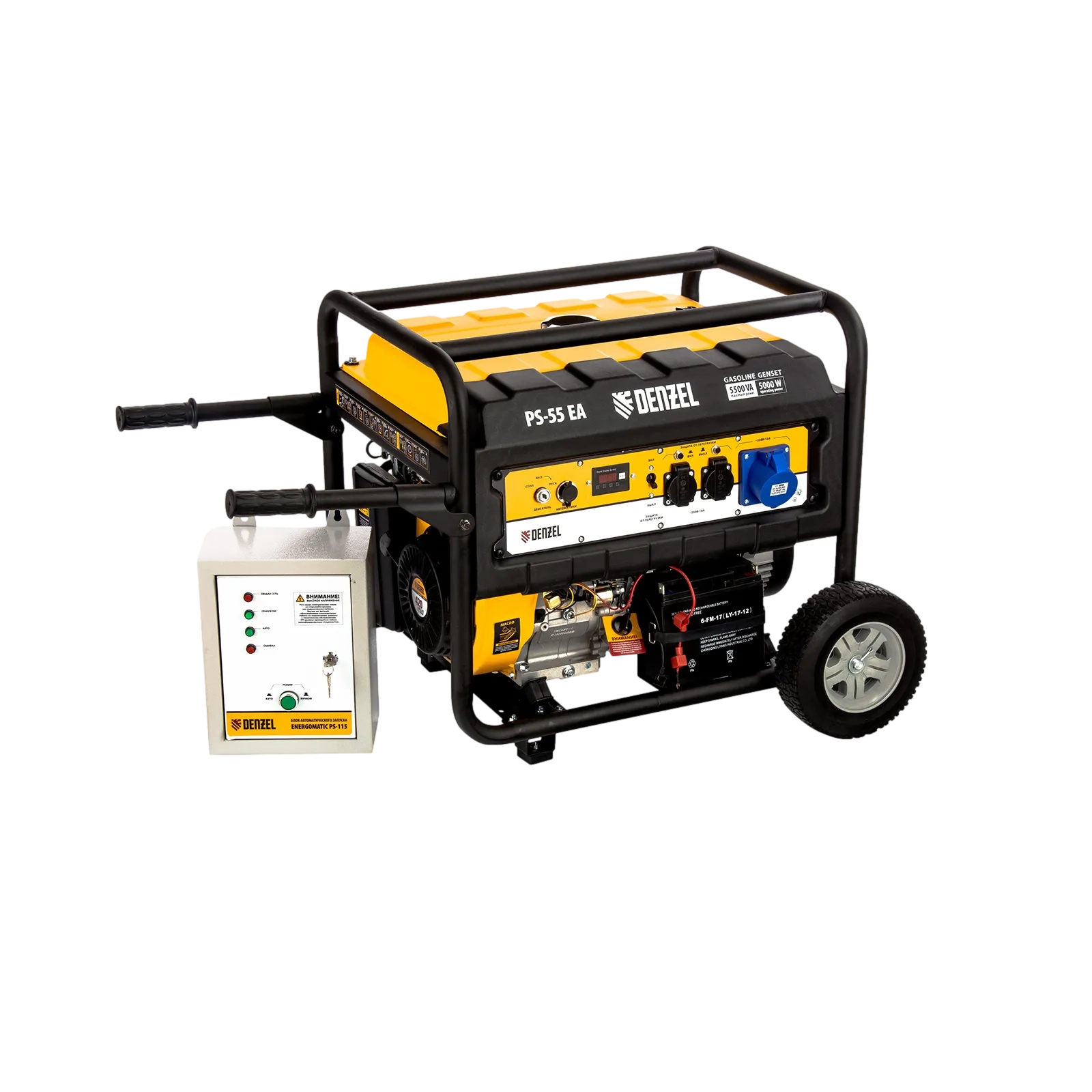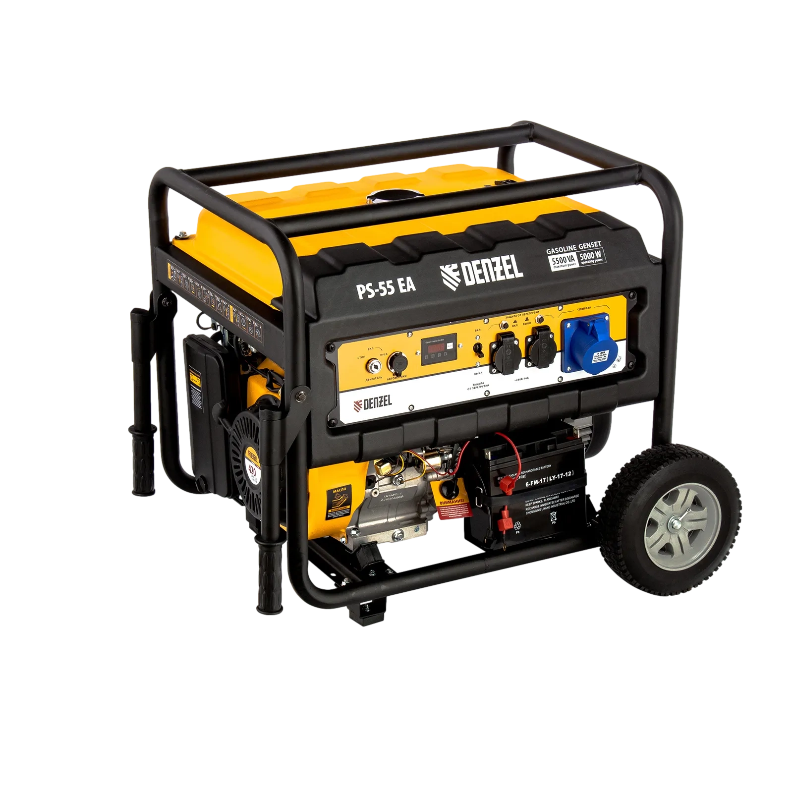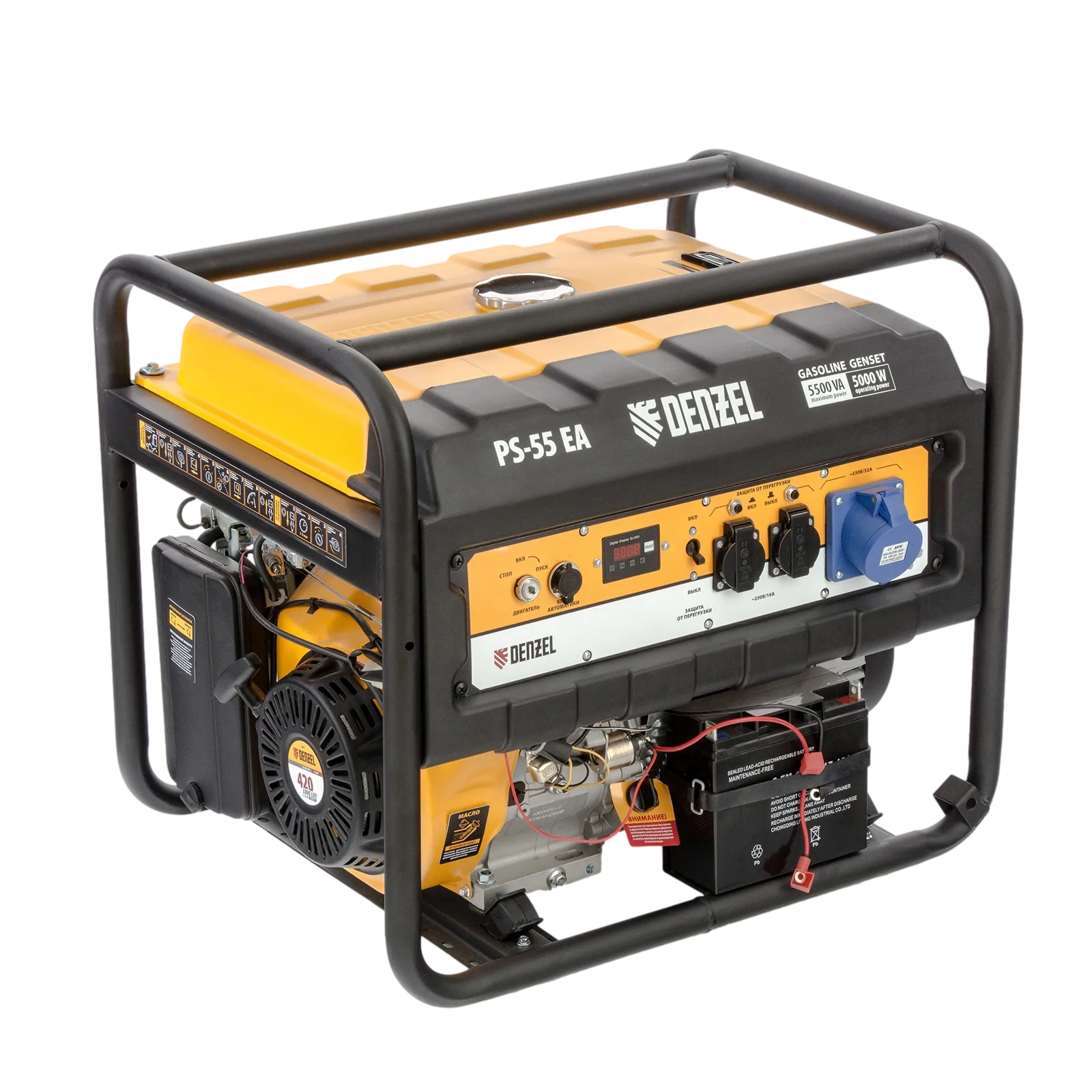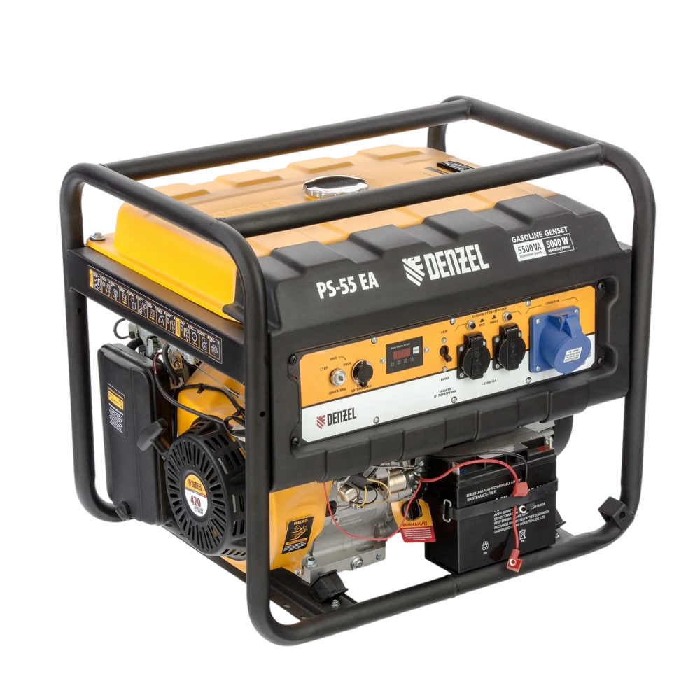 ПроизводителиГенератор бензиновый PS-55EA, 5,5 кВт, 230В, 25л, коннектор автоматики, электростартер Denzel