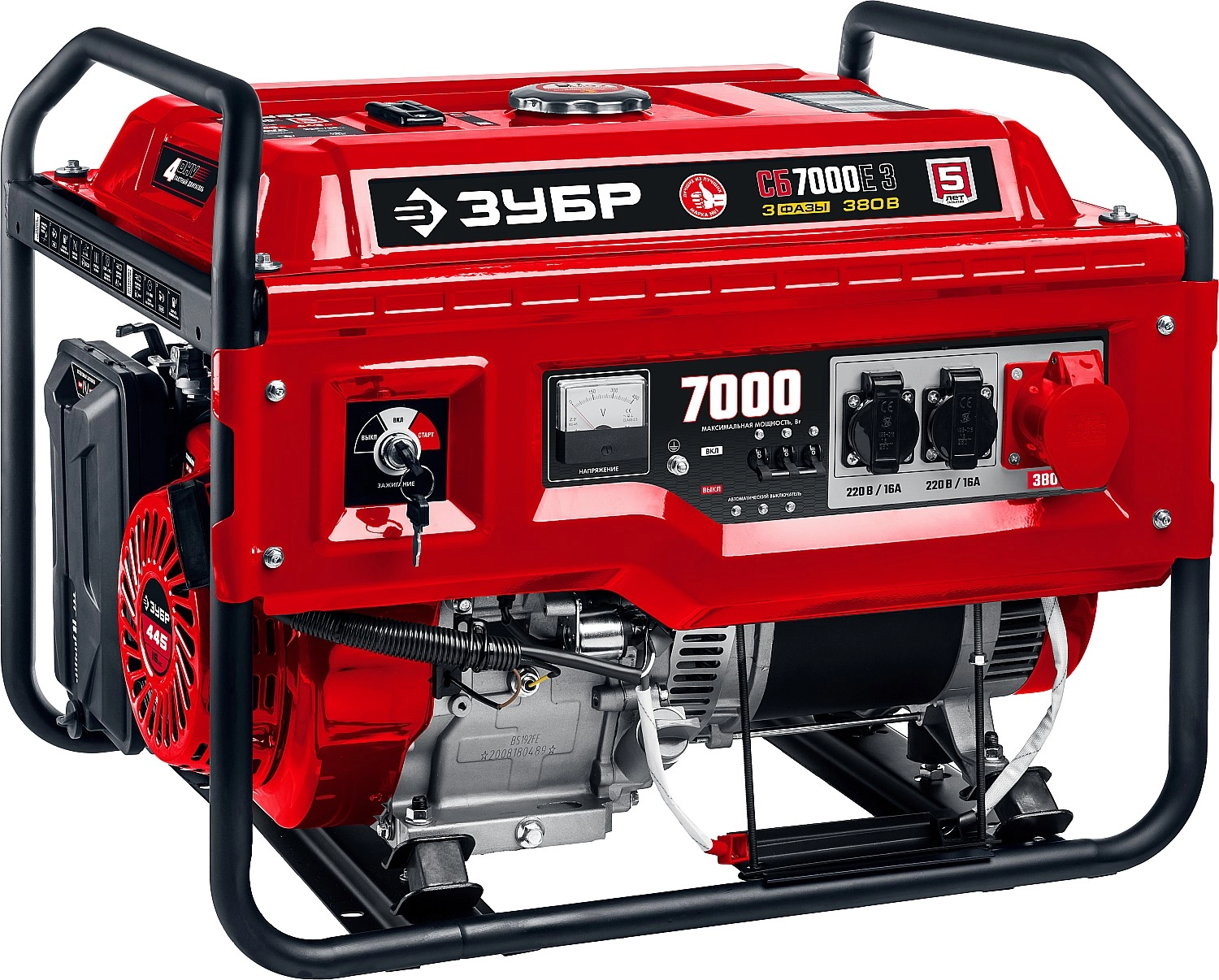 ПРОФИУровень качества. При классификации продуктов, имеющих схожее наименование, но обладающие различными потребительскими свойствами мы приняли следующий Вес факторов: 80% - подтвержденный ресурс, 15% - заявленная производительность/скорость, 5% - субъективные ощущения потребителя. ПодробнееКод товара: 0048445(0)ХарактеристикиАртикул СБ-7000Е-3Бренды ЗубрСтрана производства КитайОбъем топливного бака, л 25Напряжение 220/380Бензиновый электрогенератор ЗУБР СБ-7000Е-3, предназначен для обеспечения электрической энергией потребителей в отсутствии электрической сети, а также для использования в качестве резервного или аварийного источника электрической энергии. Оптимальный по мощности генератор с возможностью подключения трехфазного потребителя электроэнергии. Электрозапуск генератора избавит Вас от приложения физической силы, а комплект для транспортировки генератора упрощает его перемещение. Два вида вырабатываемого напряжения - 220В 50Гц и 380В 50Гц. Системы поддержания частоты вращения и напряжения для обеспечения качества электроэнергии. Автоматические предохранители в каждой цепи, защищающие изделие и потребителей от перегрузок и коротких замыканий.Производитель: Крафтул И/Е Гмбх, Альтер Поствег Штр., Лоенинген, Германия