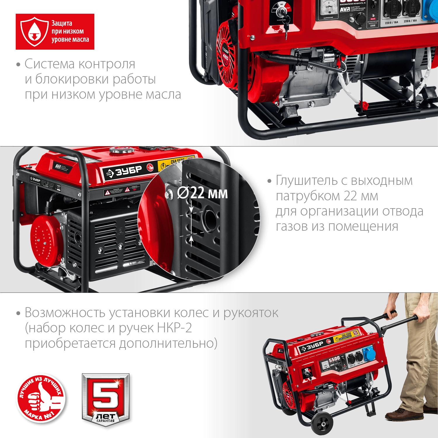 ПРОФИУровень качества. При классификации продуктов, имеющих схожее наименование, но обладающие различными потребительскими свойствами мы приняли следующий Вес факторов: 80% - подтвержденный ресурс, 15% - заявленная производительность/скорость, 5% - субъективные ощущения потребителя. ПодробнееКод товара: 0053184(0)ХарактеристикиАртикул СБА-5500Бренды ЗубрСтрана производства КитайОбъем топливного бака, л 25Напряжение 220Бензиновый электрогенератор ЗУБР СБА-5500, предназначен для обеспечения электрической энергией потребителей в отсутствии электрической сети, а также для использования в качестве резервного или аварийного источника электрической энергии. Мощный генератор, который пригодится не только в загородном доме, но и в мастерской, и на строительной площадке, и вообще везде, где нет стационарного электричества, но нужно иметь работающий приборы и инструмент. Высокое качество выходной энергии позволяет запитывать даже требовательную электронную технику. Электрический стартер не только облегчает запуск (особенно в зимнее время), но и делает его даже приятным: раз - и готово. Дополнительная розетка увеличенной мощности для подключения таких потребителей, как нагреватели, калориферы, осветительная техника или несколько потребителей одновременно. Система поддержания параметров выходного напряжения (AVR) обеспечивает стабильность характеристик для питания, в том числе наиболее требовательных потребителей.Производитель: Крафтул И/Е Гмбх, Альтер Поствег Штр., Лоенинген, Германия