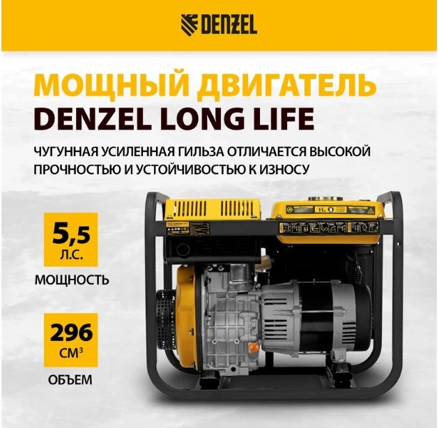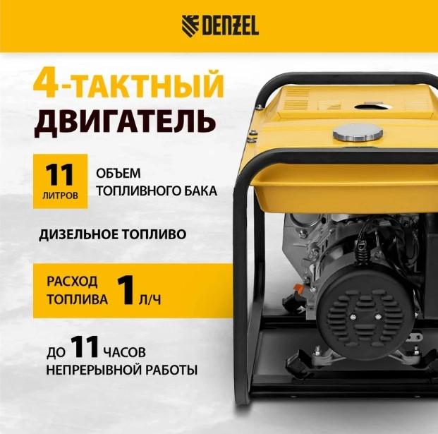 ХарактеристикиАртикул 94412Бренды DENZELСтрана производства КитайТип дизельныйЦвет черный/желтыйМатериал корпуса металлСтепень защиты IP23Объём двигателя 296Охлаждение воздушноеЗащита от перегрузки 2405Индикатор уровня топлива ДаСчетчик моточасов НетТип генератора синхронныйКонструкция двигателя четырехтактныйМощность двигателя 5.5Исполнение открытоеЁмкость топливного бака 11Максимальная активная мощность 3.2Запуск ручной, электростартерВес 78.9Номинальная активная мощность 2.8Выходное переменное напряжение 230Время непрерывной работы 11Индикация перегрузки ДаРасход топлива 1Глушитель ДаКоличество розеток 3Индикатор уровня масла ДаДлина 660Уровень шума 110Объем масленого бака 1.1Ширина 465Количество цилиндров 1Высота 540Количество розеток 12 В 1Количество розеток 220 В 2Используемое топливо дизельСила тока 16Стабилизация напряжения АВР (AVR)Материал обмотки медьШирина в упаковке 65Высота в упаковке 65Глубина в упаковке 70Ручка для переноски ДаОписание товара обновлено 08.12.2025 14:46:29Генератор дизельный Denzel DES-32E 94412 с объемом топливного бака 11 л, с электростартером, имеет максимальную выходную мощность 3,2 кВт и поддерживает напряжение в сети 230 В. Используется для снабжения энергией потребителей однофазного тока (осветительных приборов, бытовой техники, электроинструмента) при отсутствии доступа к стационарному источнику питания. Для подключения электроприборов служат 2 розетки 230 В/16 А. Клеммы постоянного тока 12 В позволяют заряжать автомобильные аккумуляторы, а двойной выход USB 5 В предназначен для подключения мобильных устройств (планшетов, смартфонов и т. д.). Генератор пригодится в загородном доме.Производитель: ООО "Мир инструмента", Россия