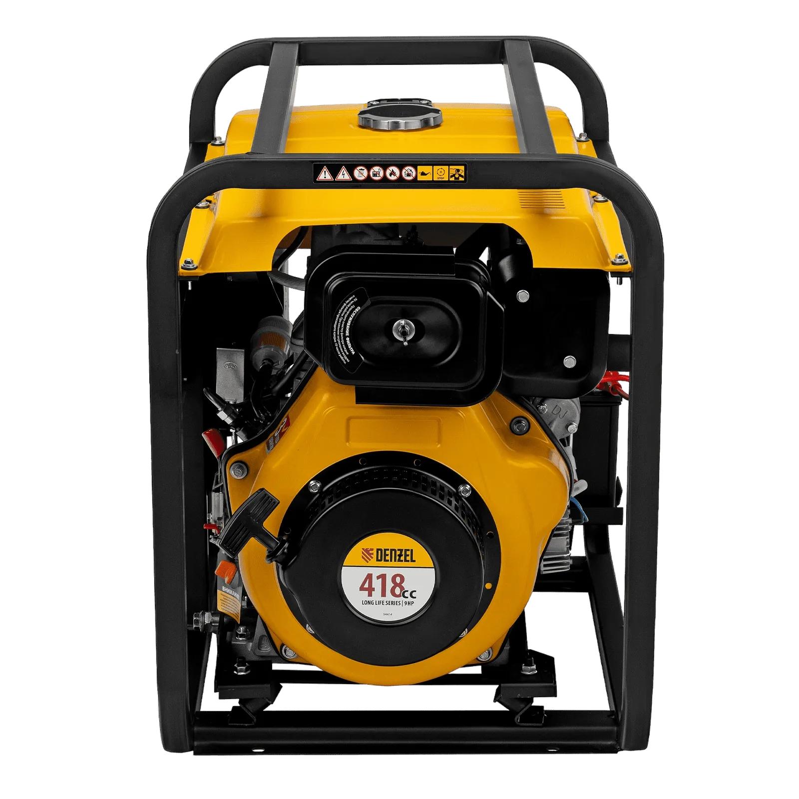 - Мобильность — к генератору можно приобрести транспортировочный комплект Denzel 94906 для перемещения по рабочей площадке.