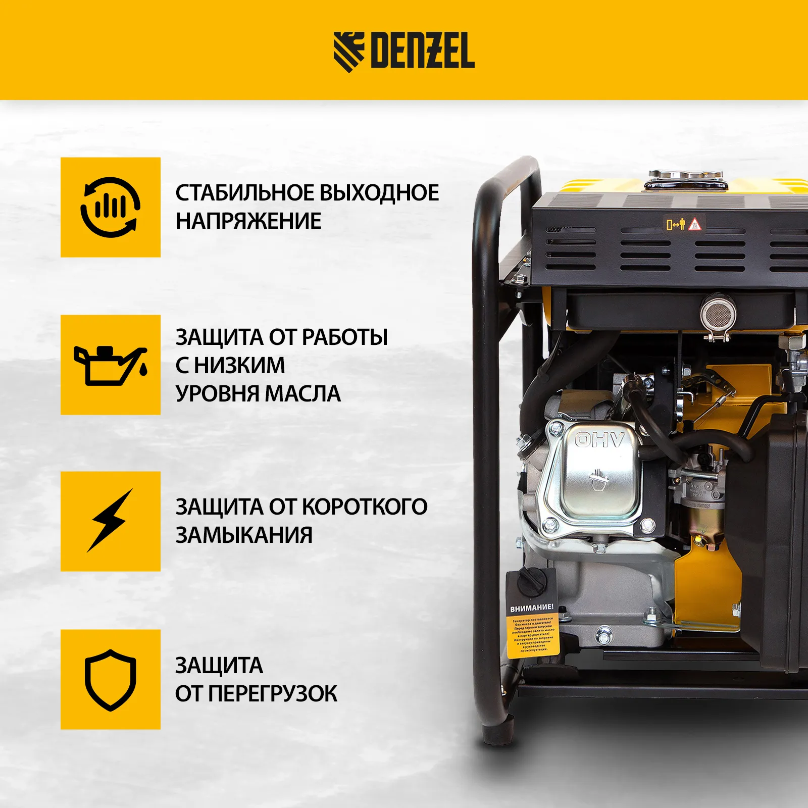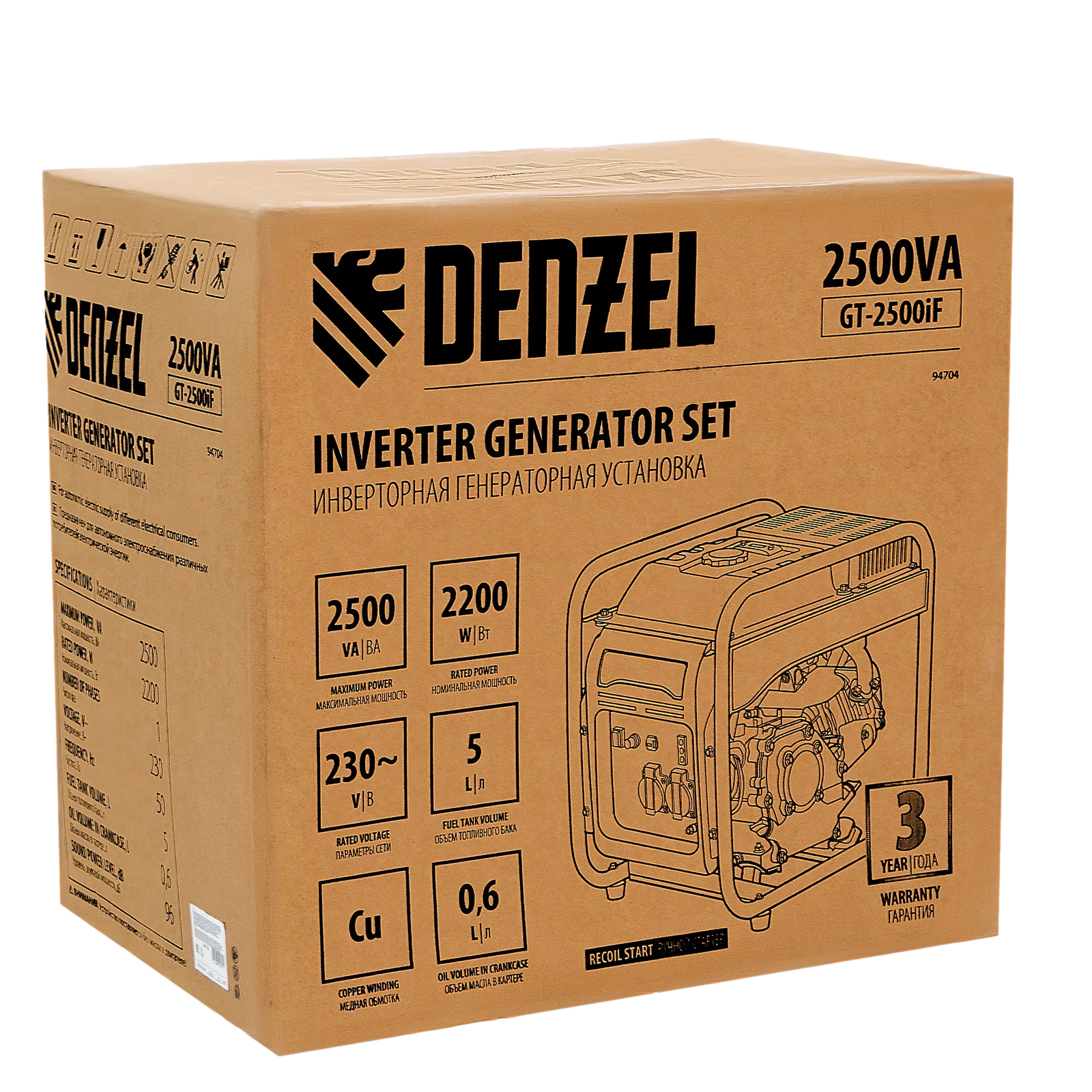 Инверторный генератор Denzel GT-2500iF 94704 мощностью 2,5 кВт, в открытом корпусе, с ручным стартом, — легкий и экономичный, но при этом достаточно мощный, с ним легко справится даже неопытный пользователь. Идеально подходит для для использования на даче, в гараже, в мастерской и на природе. Четырехтактный двигатель Genzel Long Life мощностью 7 л.с. и объемом 212 куб. см работает стабильно и имеет относительно невысокий уровень шума (96 дБ) и вибраций. Прочная рама защищает рабочие элементы от повреждений в процессе работы и транспортировки.Генератор - 1 шт