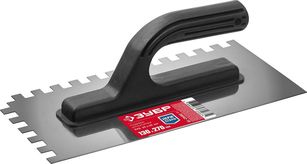 ПроизводителиГладилка нерж. зубчат. 130х270мм, зуб 10мм, пласт. рук. (08042-10) ЗУБР