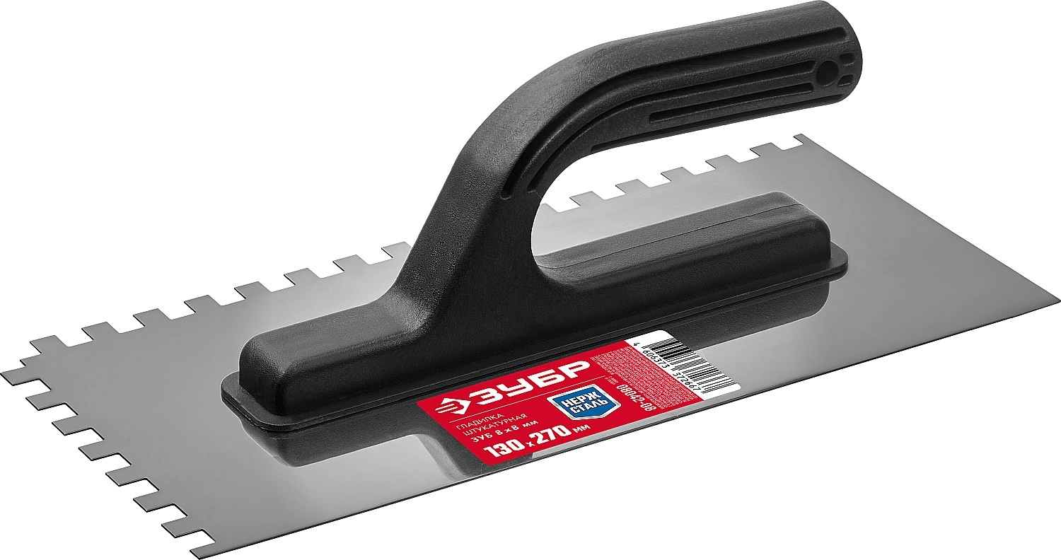 ПроизводителиГладилка нерж. зубчат. 130х270мм, зуб 8мм, пласт. рук. (08042-08) ЗУБР