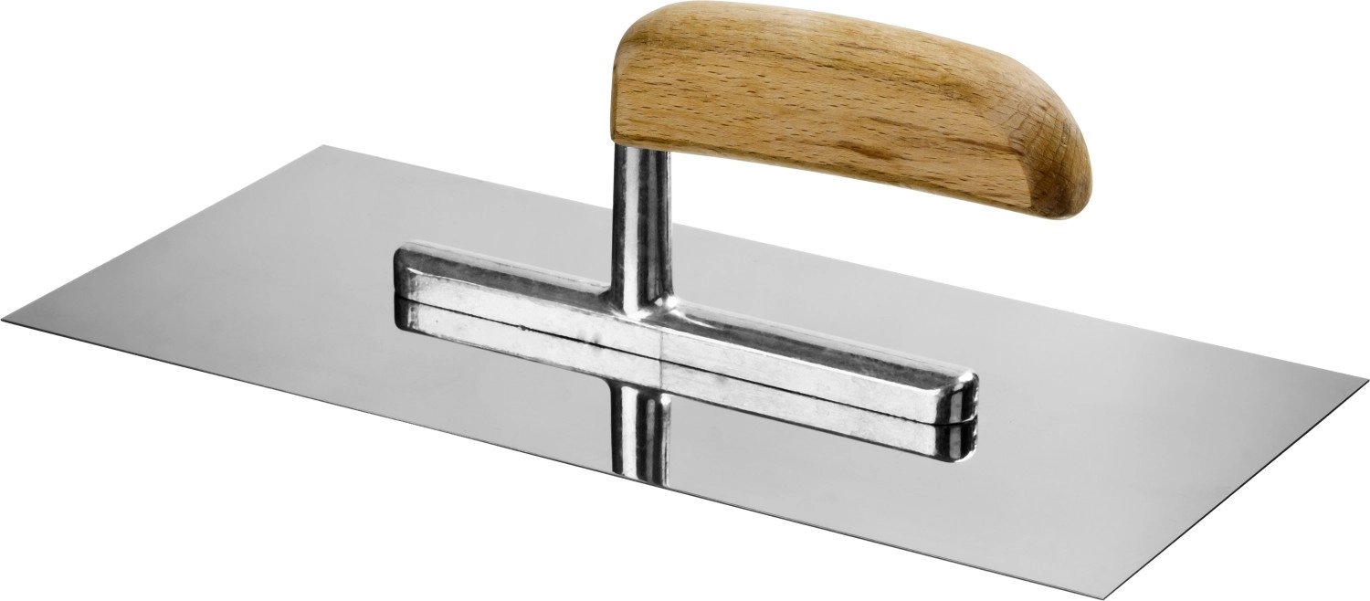 Зеркально отполированное нержавеющее полотно обеспечит надежность конструкции, лучшую защиту от коррозии, а удобная деревянная рукоять обеспечит комфортную работу при нанесении и распределении штукатурных смесей и клеевых составов.