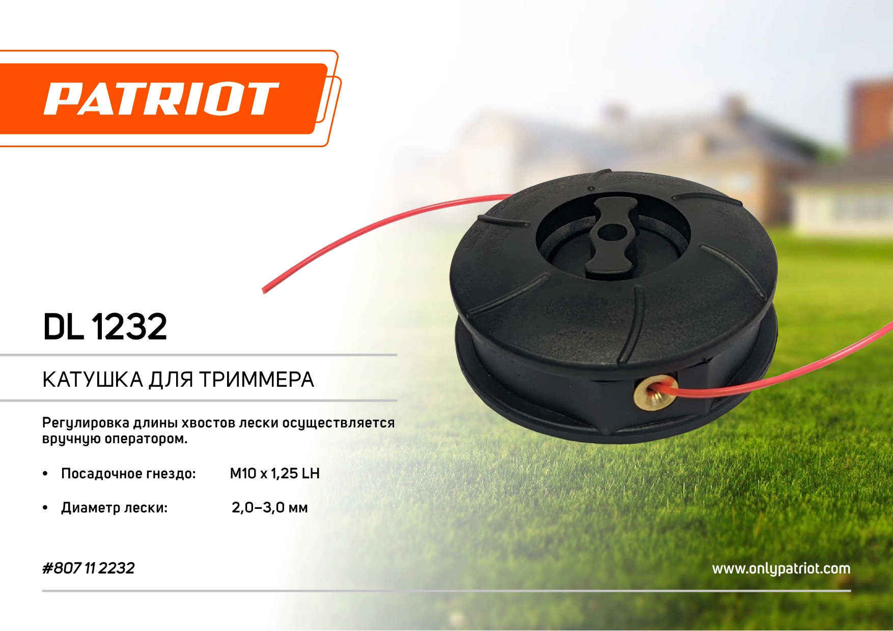 Катушка Patriot DL-1232 подходит ко всем бензотриммерам с прямой штангой. Применяется для скашивания травы любых видов. Крепление на оси М10х1,25 LH. Диаметр лески 2,0-3,0 мм. Регулировка длины хвостов лески осуществляется вручную оператором.Производитель: MD Groupe Limited, Room 405, No 1518, Pin Building, Zhang Yang Road, PuDong Area, ShangHai, China