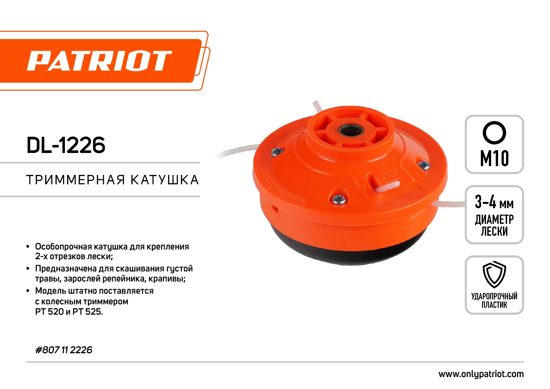 ПроизводителиГоловка триммерная ручн. усиленная DL1226 ( лески 4,0мм резьба М10х1,25 левая) PATRIOT / EXPERT