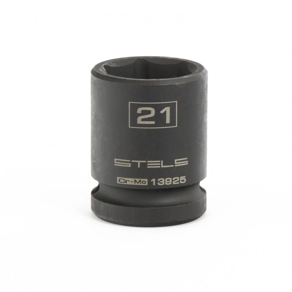 Ударная шестигранная головка Stels 13925 размером 21 мм, из стали CrMo, с присоединительным квадратом 1/2 дюйма, — сменная насадка для электрических и пневматических гайковертов.