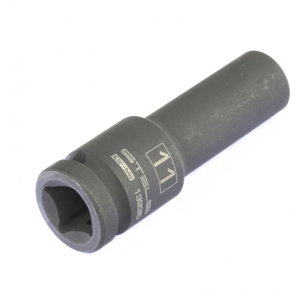 Ударная удлиненная шестигранная головка Stels 13935 размером 11 мм, из стали CrMo, с присоединительным квадратом 1/2 дюйма, предназначена для монтажа и демонтажа резьбовых соединений с помощью пневматического или электрического гайковерта.
