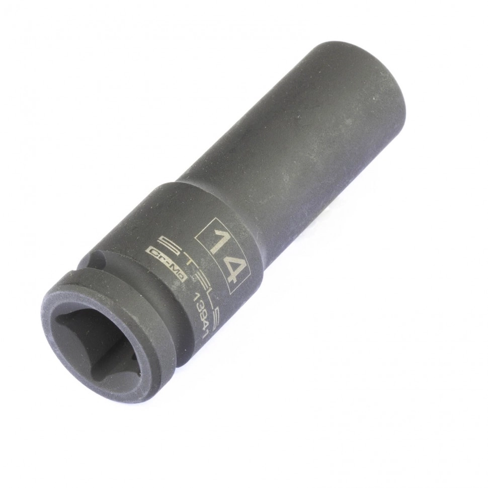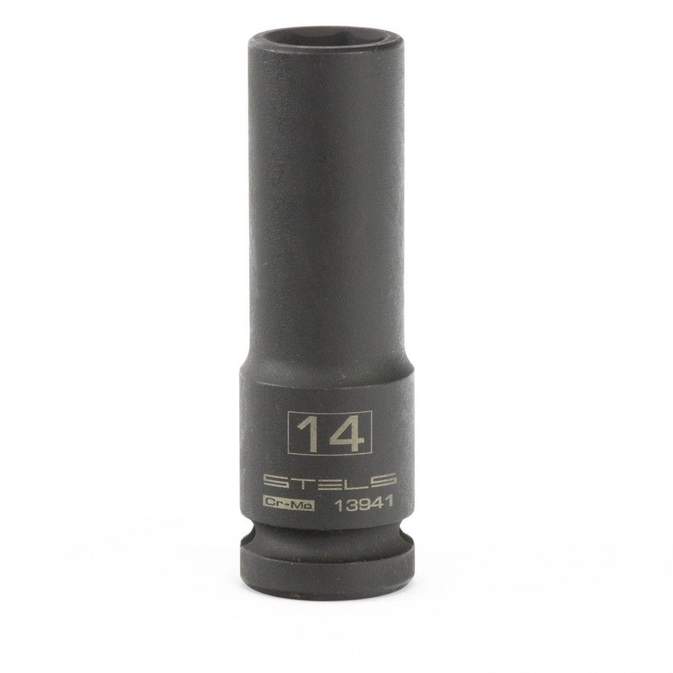 Ударная удлиненная шестигранная головка Stels 13941 размером 14 мм, из стали CrMo, с присоединительным квадратом 1/2 дюйма, предназначена для монтажа и демонтажа резьбовых соединений с помощью пневматического или электрического гайковерта.
