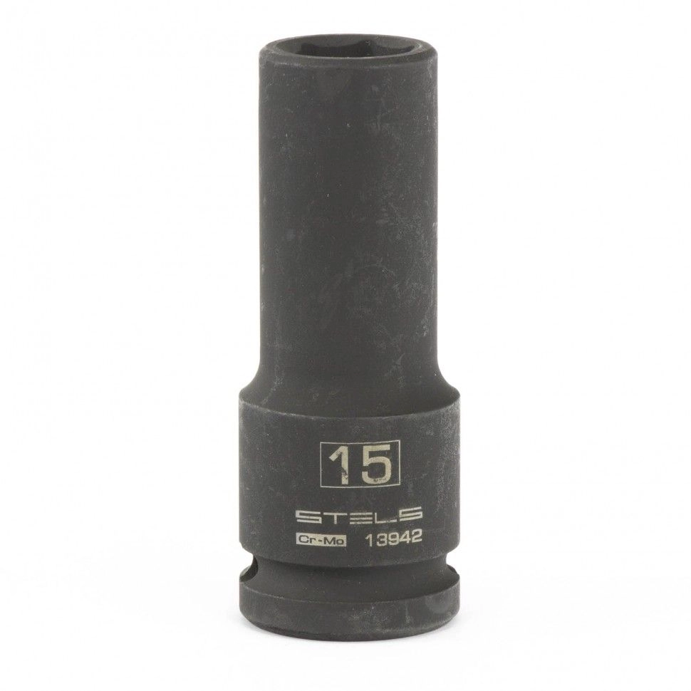Ударная удлиненная шестигранная головка Stels 13942 размером 15 мм, из стали CrMo, с присоединительным квадратом 1/2 дюйма, предназначена для монтажа и демонтажа резьбовых соединений с помощью пневматического или электрического гайковерта.
