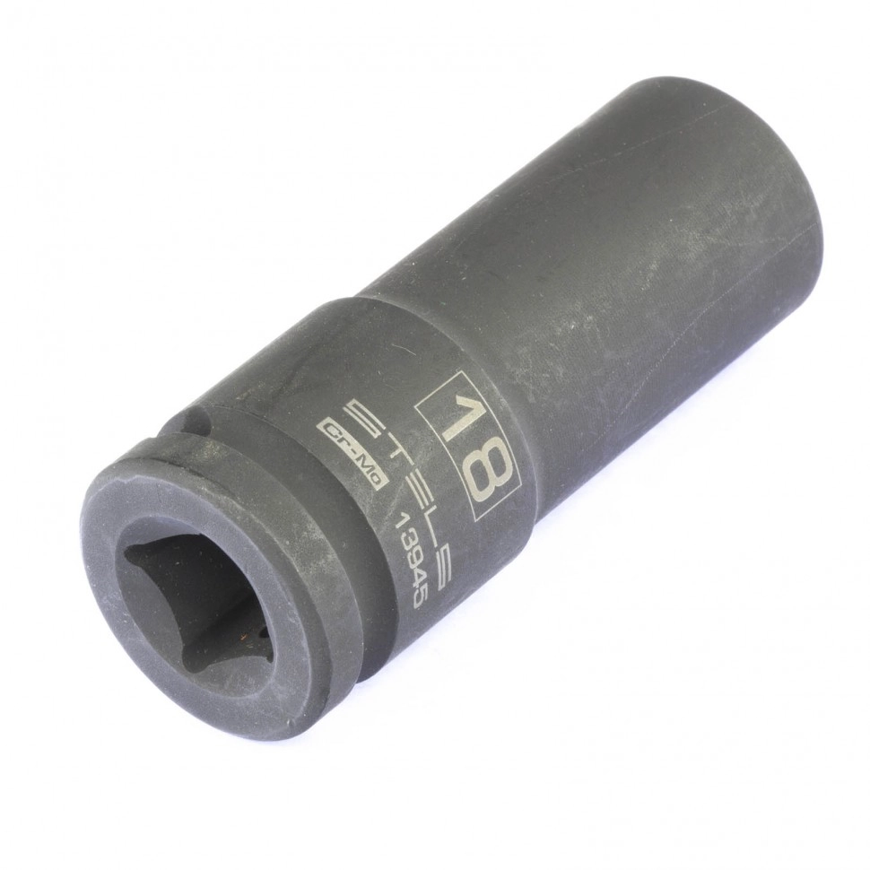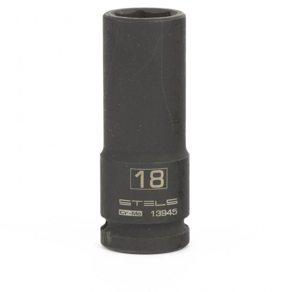 Ударная удлиненная шестигранная головка Stels 13945 размером 18 мм, из стали CrMo, с присоединительным квадратом 1/2 дюйма, предназначена для монтажа и демонтажа резьбовых соединений с помощью пневматического или электрического гайковерта.
