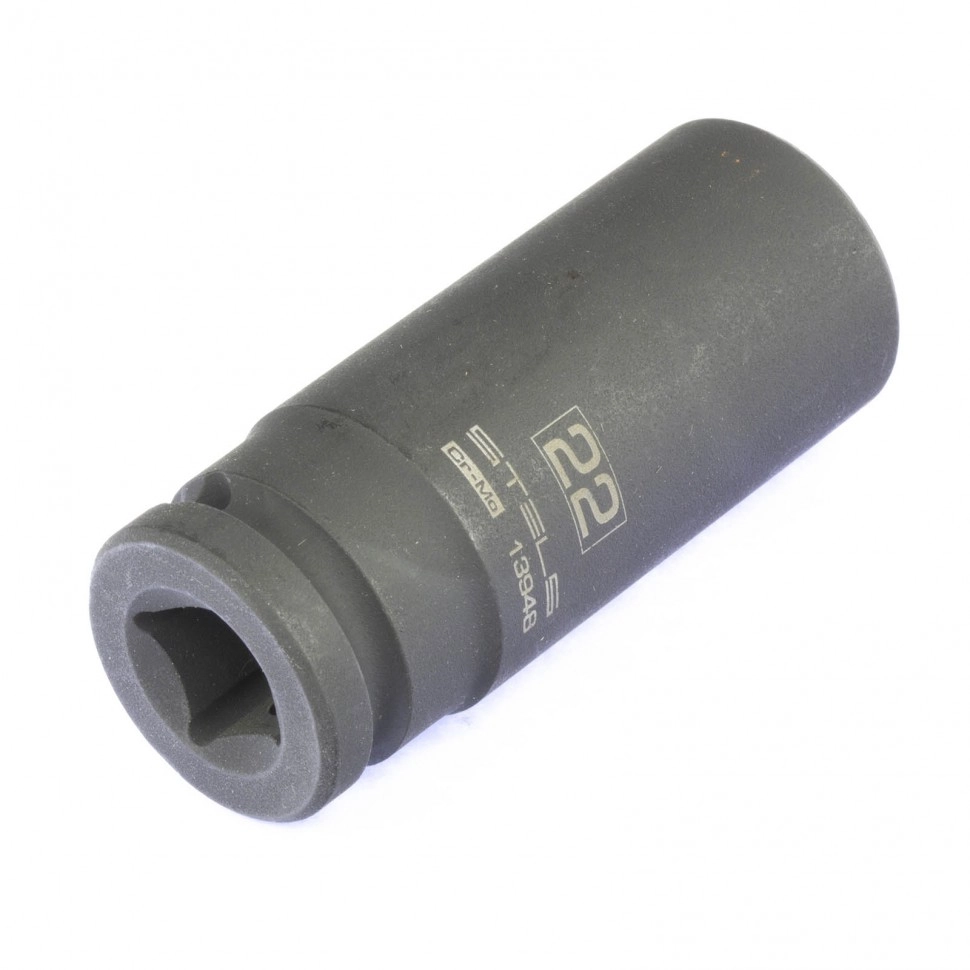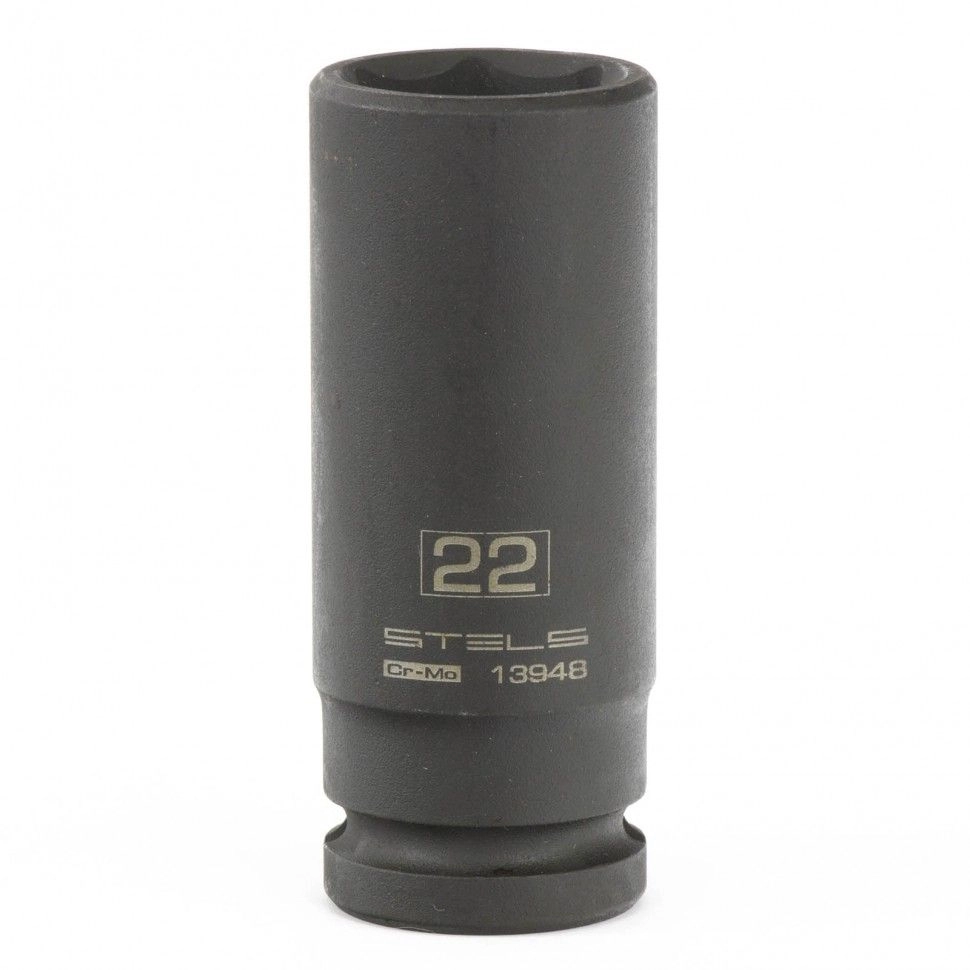 Ударная удлиненная шестигранная головка Stels 13948 размером 22 мм, из стали CrMo, с присоединительным квадратом 1/2 дюйма, предназначена для монтажа и демонтажа резьбовых соединений с помощью пневматического или электрического гайковерта.