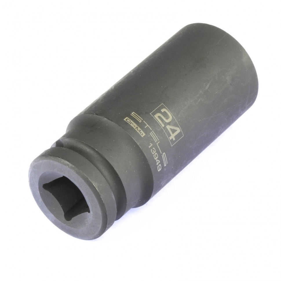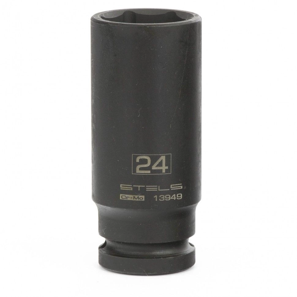 Ударная удлиненная шестигранная головка Stels 13949 размером 24 мм, из стали CrMo, с присоединительным квадратом 1/2 дюйма, предназначена для монтажа и демонтажа резьбовых соединений с помощью пневматического или электрического гайковерта.
