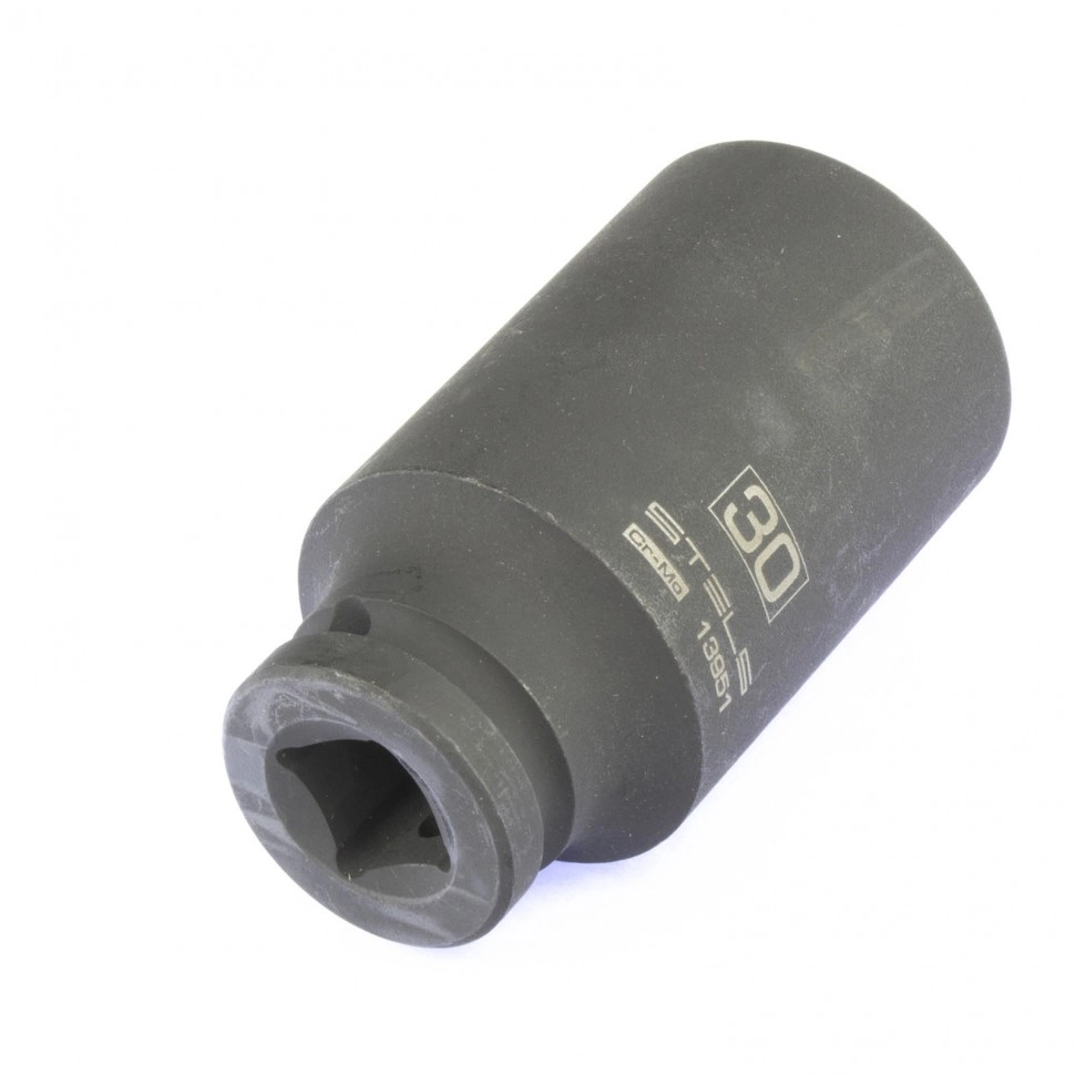 Ударная удлиненная шестигранная головка Stels 13951 размером 30 мм, из стали CrMo, с присоединительным квадратом 1/2 дюйма, предназначена для монтажа и демонтажа резьбовых соединений с помощью пневматического или электрического гайковерта.
