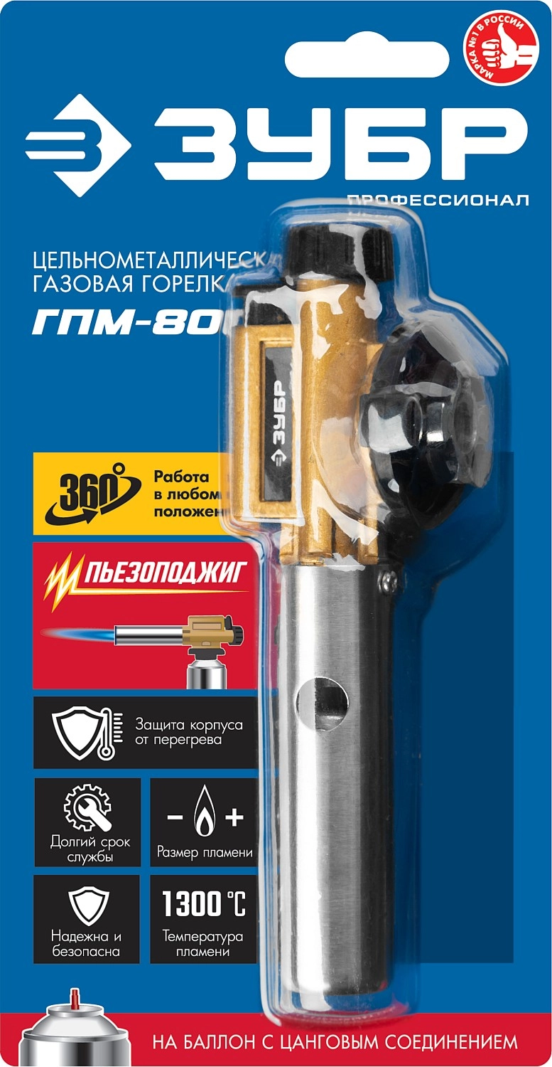 ПроизводителиГорелка газовая с пъезоподжигом, цельнометал., цанговое соед., 1300°C "ГПМ-800" (55550) ЗУБР