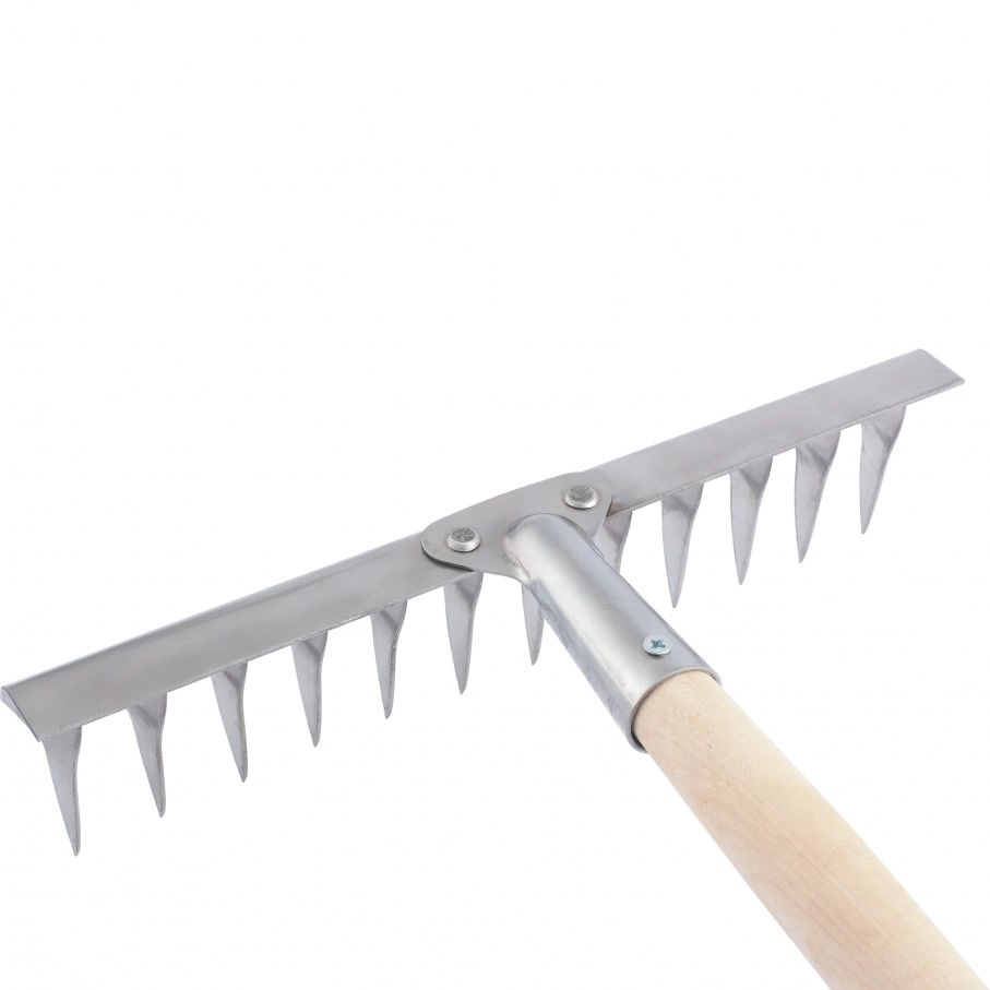 Грабли установлены на деревянный черенок и полностью готовы к использованию.