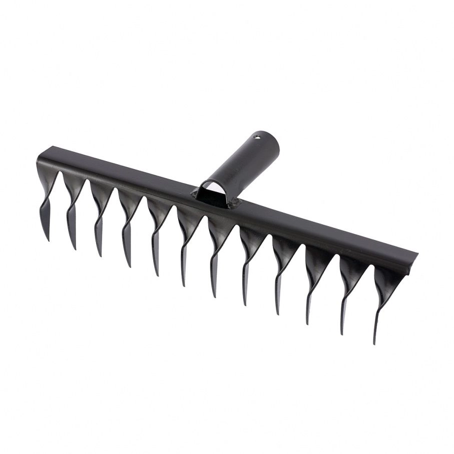 Стальные грабли Сибртех 61740 с 12 витыми зубьями и шириной гребенки 300 мм, без черенка, служат для уборки с газонов и грядок листвы и мусора, а также позволяют проводить аэрацию почвы.