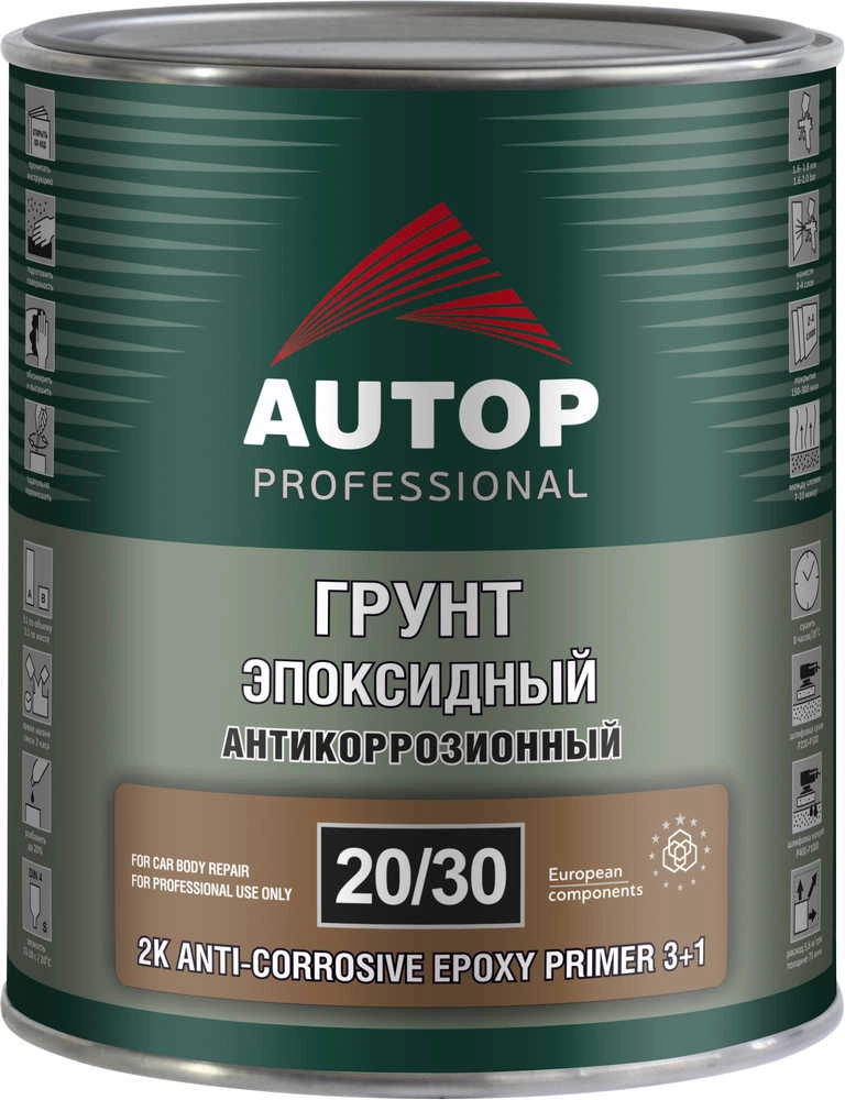 Двухкомпонентный грунт-наполнитель на основе эпоксидной смолы предназначен для ремонтной покраски автомобилей. Обладает высокой химической стойкостью, повышенными антикоррозионными свойствами и очень хорошей наполняющей способностью. Может применяться как в шлифуемой, так и в нешлифуемой версии — нанесение «мокрый по мокрому». Наносится на предварительно отшлифованные поверхности: старые лакокрасочные покрытия, чистый и оцинкованный металл, алюминий, полиэфирные подложки, усиленный термопластичный полиуретан. Также используется в качестве грунтовки перед нанесением жидкой шпаклевки и других полиэфирных шпаклевок. Эпоксидный грунт нельзя применять совместно с кислотными грунтами. Используется только в комплексе с фирменным отвердителем AUTOP 20/30. Грунт эпоксидный AUTOP отличается своей уникальной формулой, которая обеспечивает отличную адгезию к различным материалам, включая металл, сталь и алюминий. Этот грунт для авто идеальнПроизводитель: