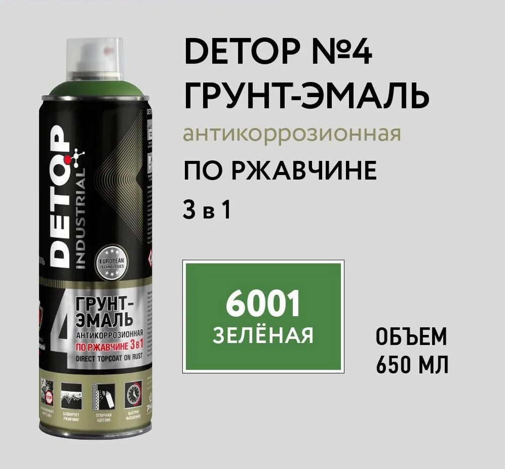 ПроизводителиГрунт-эмаль по ржавчине 3 в 1 - 6001 Зеленая - Аэрозоль 650мл №4 (DTI-A07714) DETOP