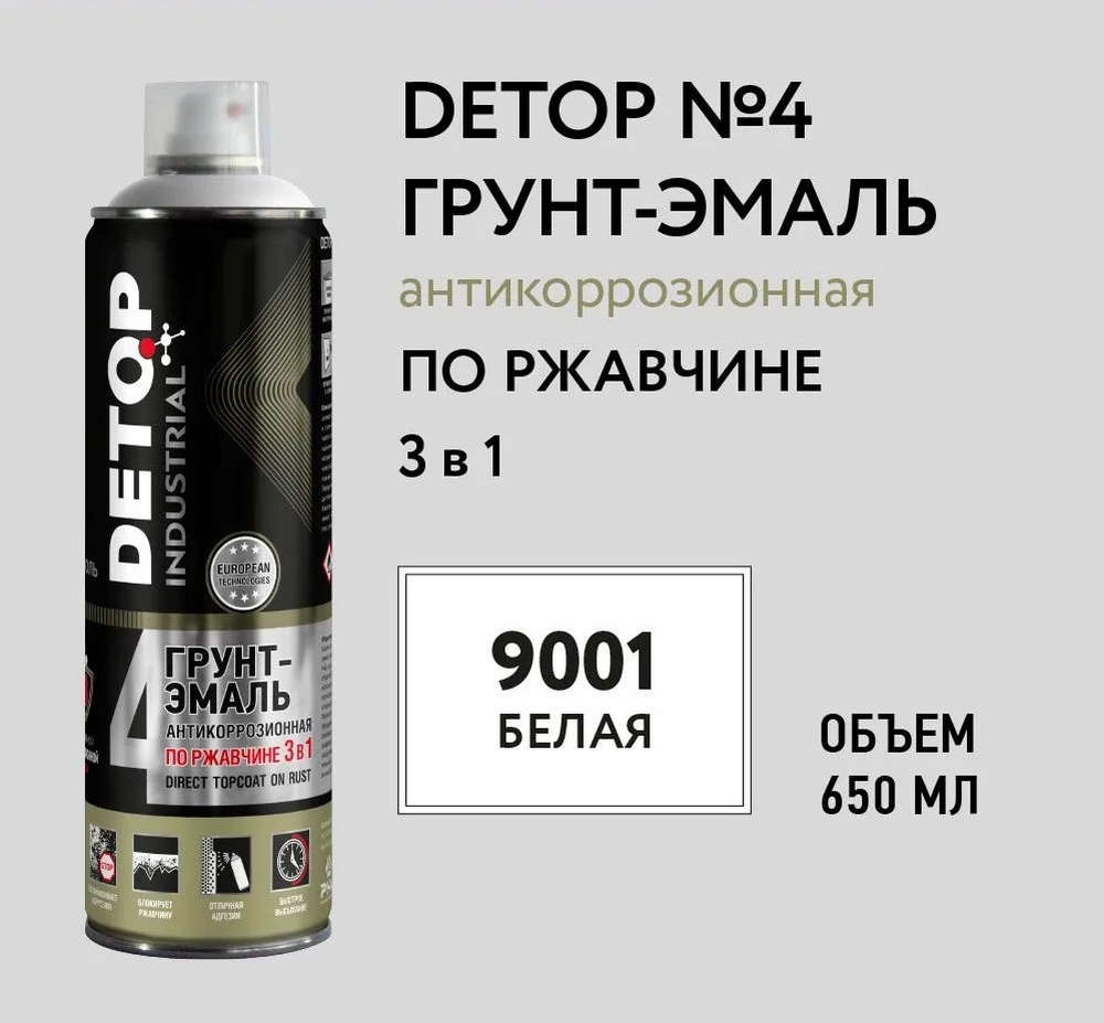 Грунт-эмаль по ржавчине DETOP №4 DTI-A07711 цвета RAL 9001 Белая выполняет функцию преобразователя ржавчины, антикоррозионного грунта и декоративной эмали. Применяется для покраски чугунных и стальных поверхностей с различной степенью коррозии: от следов коррозии до полностью покрытых ржавчиной, плотно сцепленной с металлом, толщиной до 70 мкм. Предназначена для защиты металлических конструкций промышленного назначения, очистка которых затруднена. Используется для покраски поверхностей, подвергающихся атмосферному воздействию, в том числе промышленной атмосферы, содержащей агрессивные газы и пары, соли и другие химические реагенты, имеющие температуру не выше +60°С. Преимущества Наносится прямо на ржавчину. Отличная адгезия и укрывистость. Превосходные антикоррозийные свойства. Останавливает коррозию и блокирует ржавчину. Равномерно наносится и хорошо растекается. Быстро сохнет. ПодложкиПроизводитель: