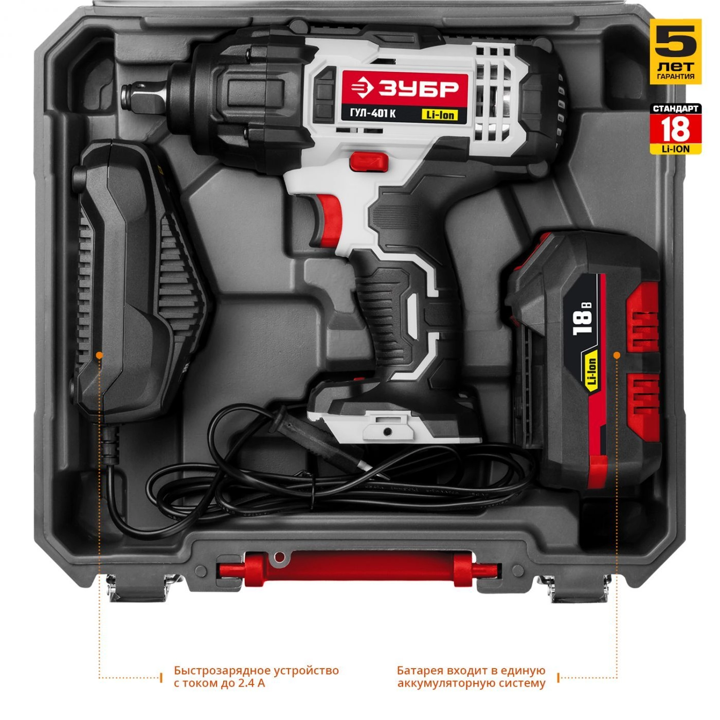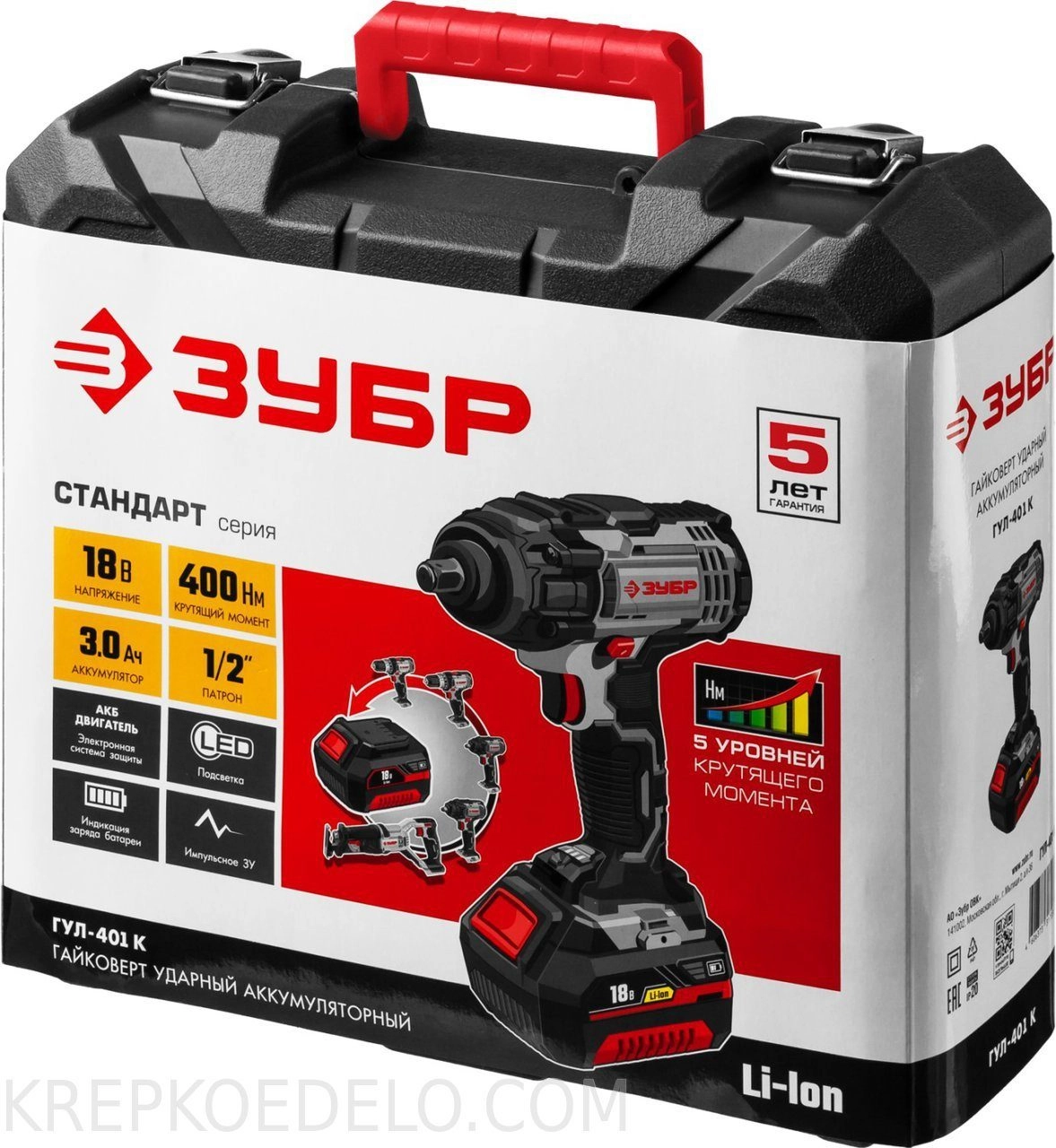 СТАНДАРТУровень качества. При классификации продуктов, имеющих схожее наименование, но обладающие различными потребительскими свойствами мы приняли следующий Вес факторов: 80% - подтвержденный ресурс, 15% - заявленная производительность/скорость, 5% - субъективные ощущения потребителя. ПодробнееКод товара: 0031579ХарактеристикиАртикул ГУЛ-401 КБренды ЗубрСтрана производства КитайТип ударный гайковертМакс. крутящий момент 400Напряжение аккумулятора 18Скорость вращения 2300Цвет красный/черныйЕмкость аккумулятора 3Кейс в комплекте естьРежимы работы гайковертТормоз двигателя ДаКоличество ступеней крутящего момента 5Аккумулятор в комплекте ДаВес 2600Питание аккумуляторПатрон четырехгранникДополнительный аккумулятор нетДлина 220Ширина 100Регулировка скорости вращения электроннаяВысота 260Скорость удара 3200Реверс естьДополнительная рукоятка нетПредохранительная муфта нетКейс естьБлокировка кнопки включения нет1-ая скорость редуктора 0-1500 об/минПылесборник естьПодсветка естьКоличество оборотов холостого хода 2300Съемный аккумулятор ДаИндикатор уровня заряда аккумулятора естьКоличество аккумуляторов в комплекте 1Время зарядки 60Дополнительный комплект угольных щеток НетЗарядное устройство естьСверла нетБиты (насадки-отвертки) нетИзменение положения рукоятки НетПрорезиненные ручки ДаМешалка (венчик) нетФонарь нетКлюч для патрона нетФиксация шпинделя НетВкладыш для кейса L-BOXX нетЭлектронная защита от перегрузок ДаМагнитный держатель на корпусе НетЛампа точечной подсветки ДаФиксация кнопки включения НетРегулировка крутящего момента 5Миксер НетРегулировка оборотов ДаОписание товара обновлено 08.12.2025 14:32:30Мощное изделие для заворачивания/отворачивания крепежа (при сборке/разборке металлических конструкций, снятии/установке колес автомобиля и т.д.). Огромный регулируемый крутящий момент и увеличенная емкость аккумулятора позволяет использовать его для самых тяжелых работ в любой профессиональной области