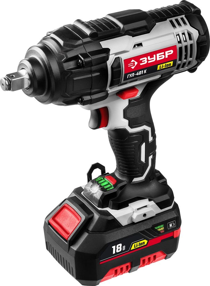 ПроизводителиГайковерт ударный аккум. ГУЛ-401 К (18.0 В, 1 акк. х 3.0 А/ч Li-Ion, 1/2", 400 Нм, чем.) ЗУБР