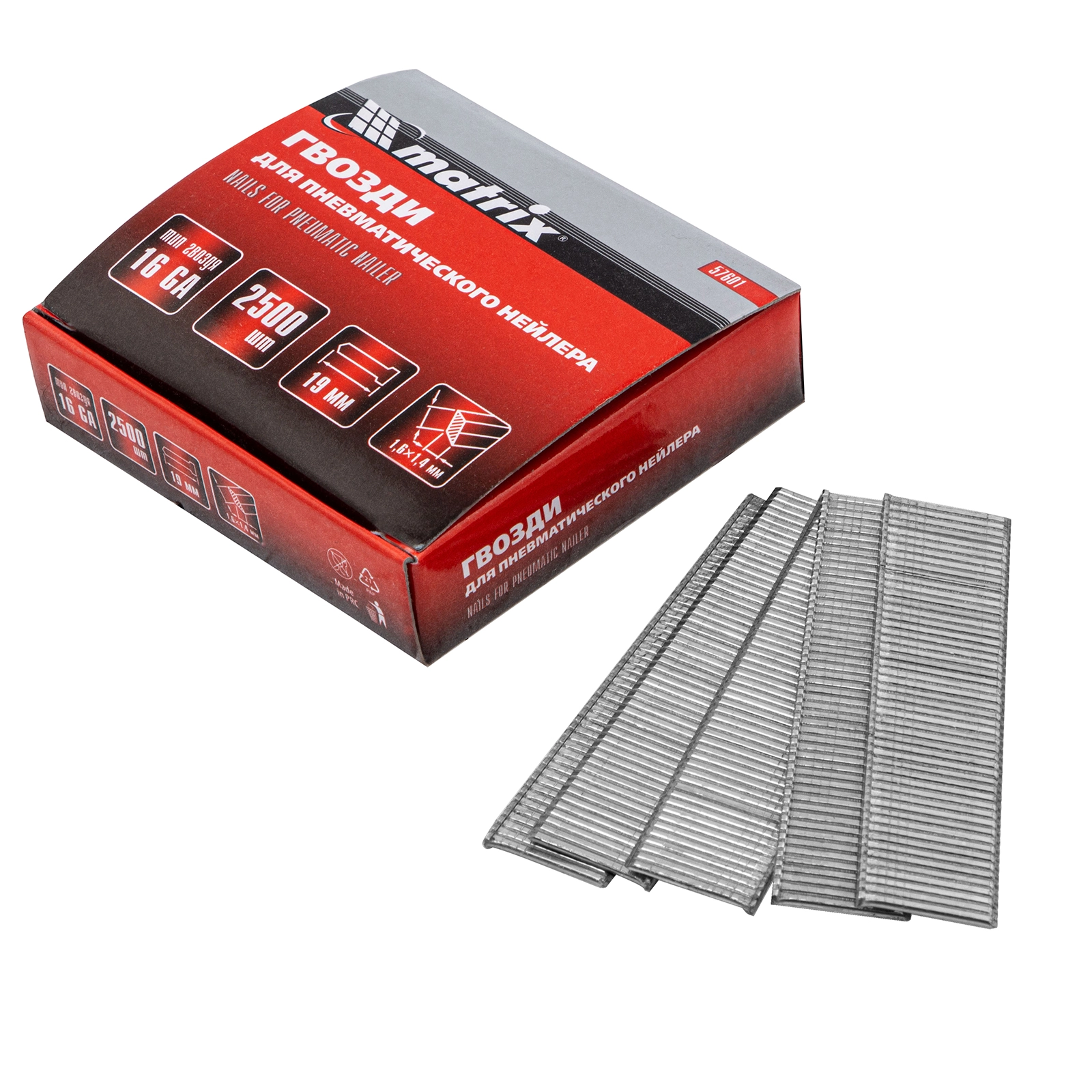 ПроизводителиГвозди 16GA для пневм. нейлера сечение 1,6х1,4, длина 19 мм, 2500 шт (57601) MATRIX