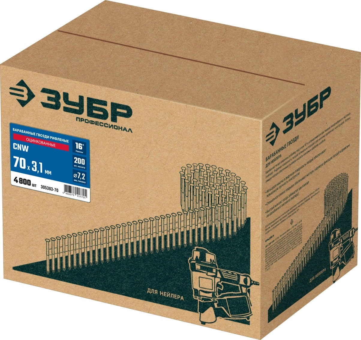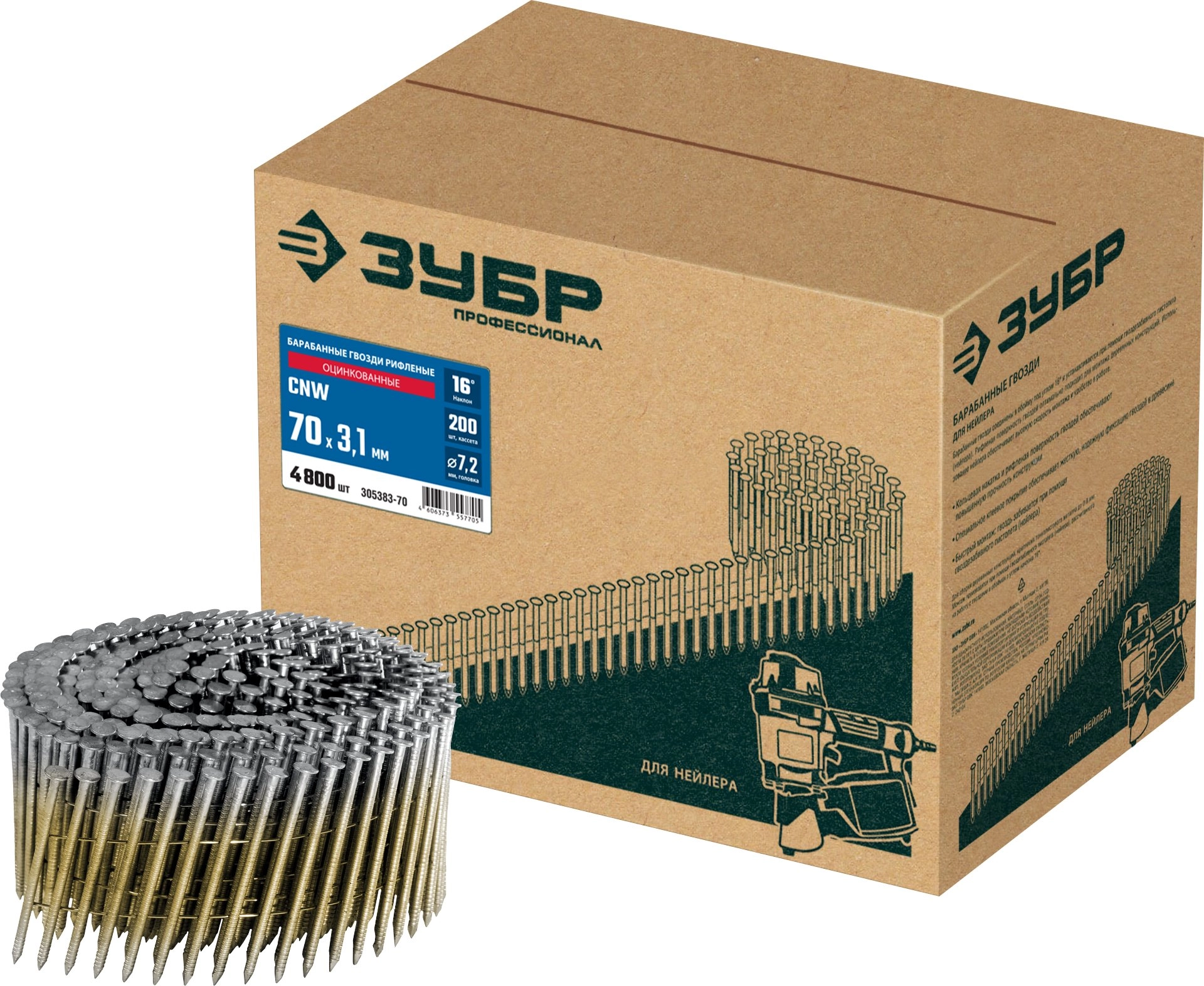 ПроизводителиГвозди барабанные рифленые оцинкованные CNW 70 х 3.1 мм, 4800 шт. (305383-70) ЗУБР