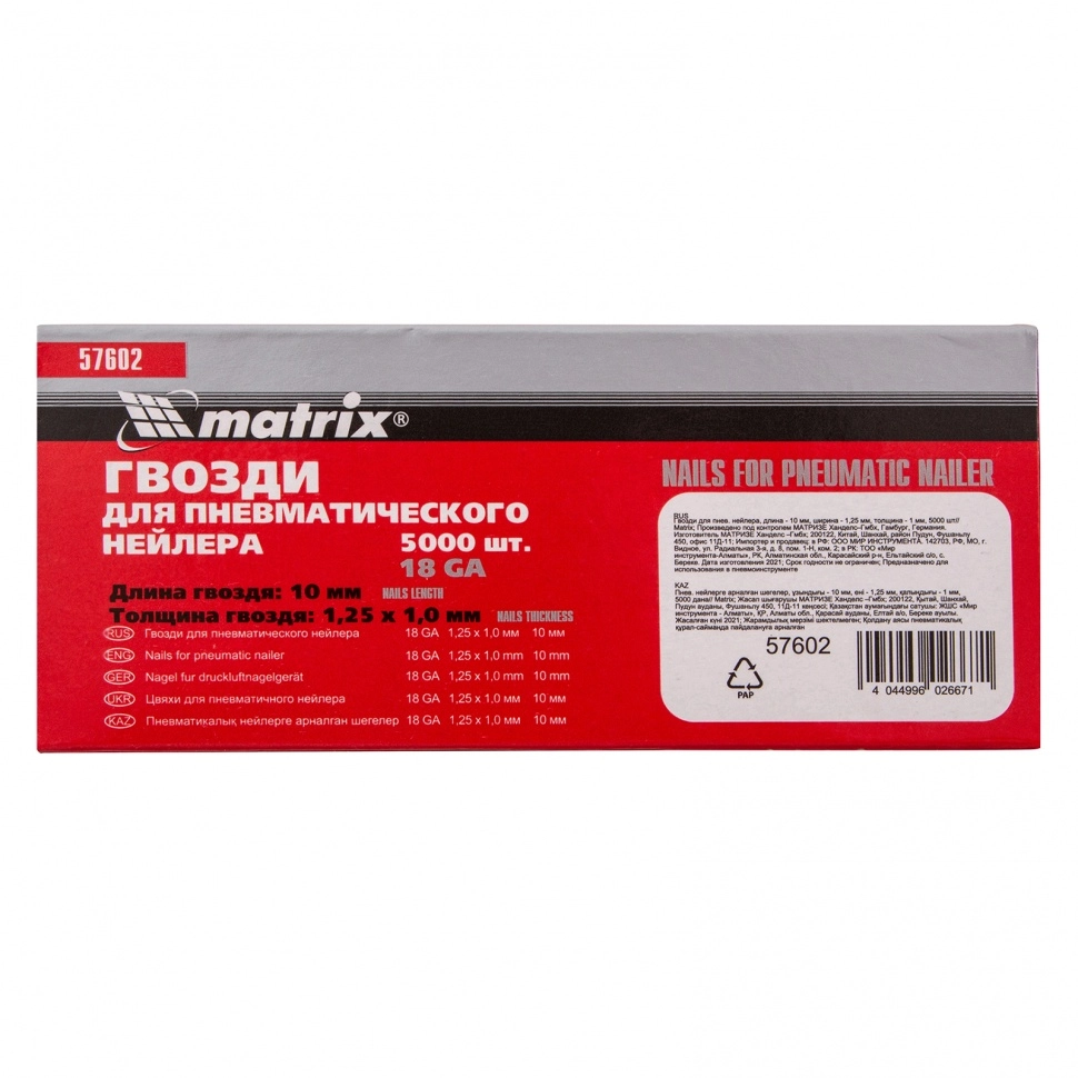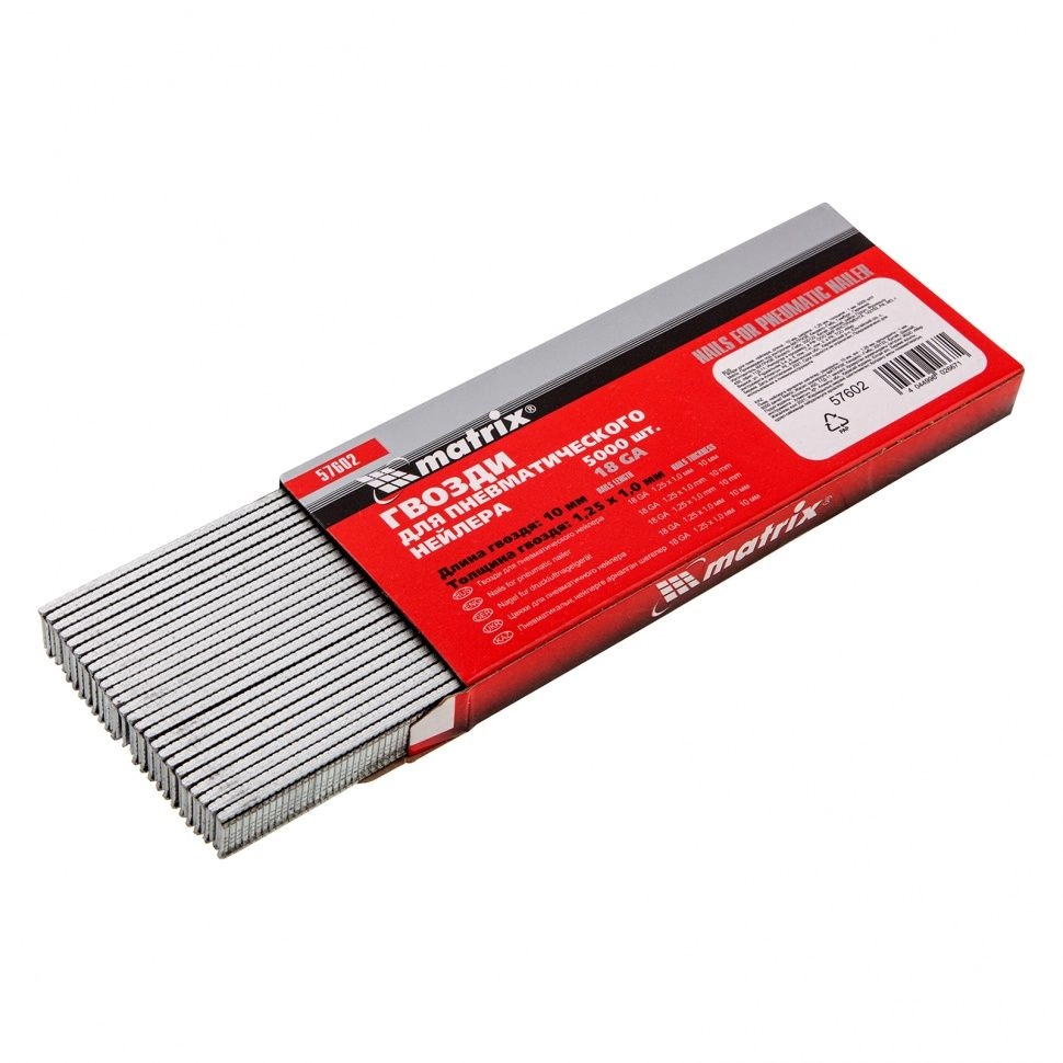 ПроизводителиГвозди для пнев. нейлера, длина - 10 мм, ширина - 1,25 мм, толщина - 1 мм, 5000 шт (57602) MATRIX
